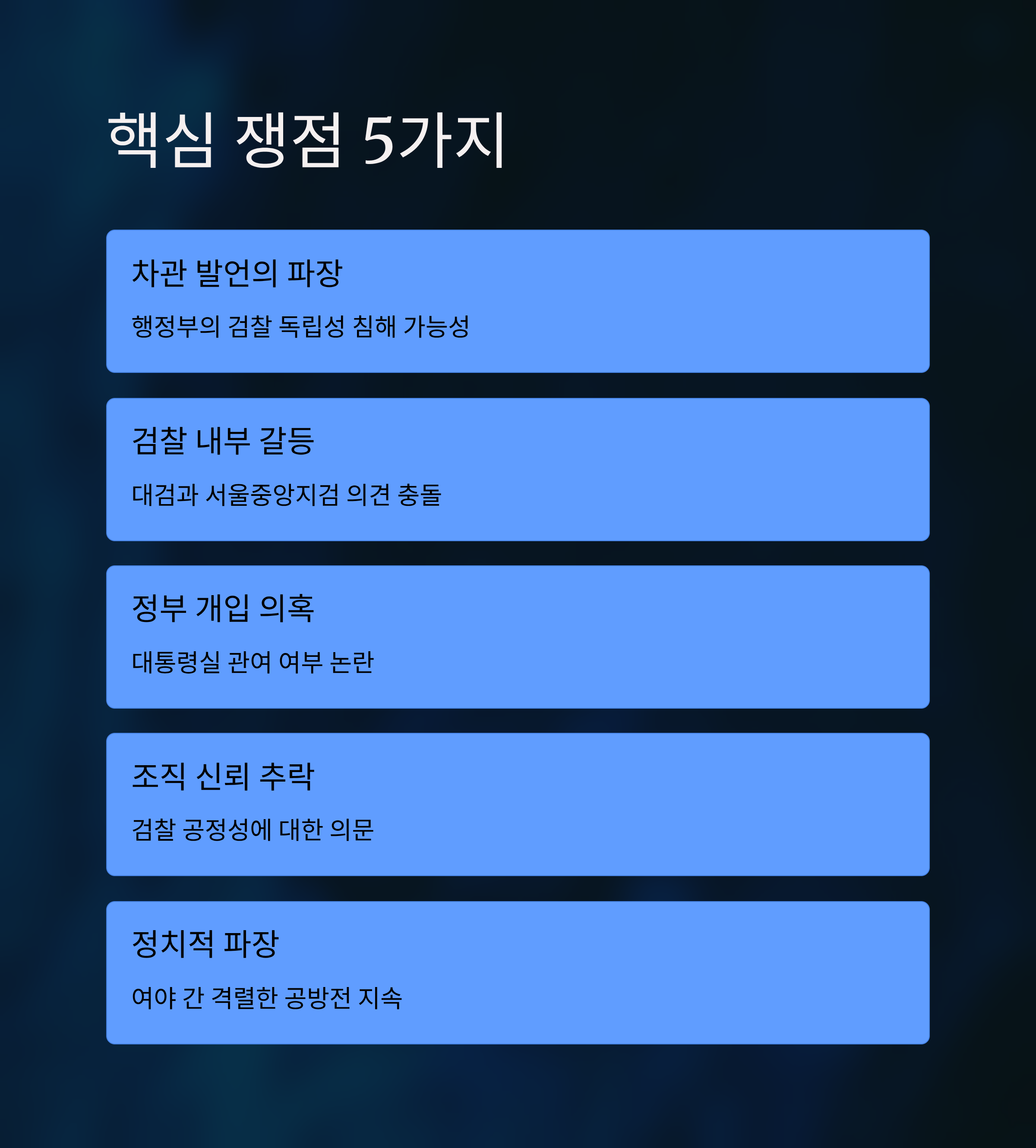 - 대검찰청과 서울중앙지방검찰청 간 갈등이 심화하며 검찰 내부의 혼란이 가중.
