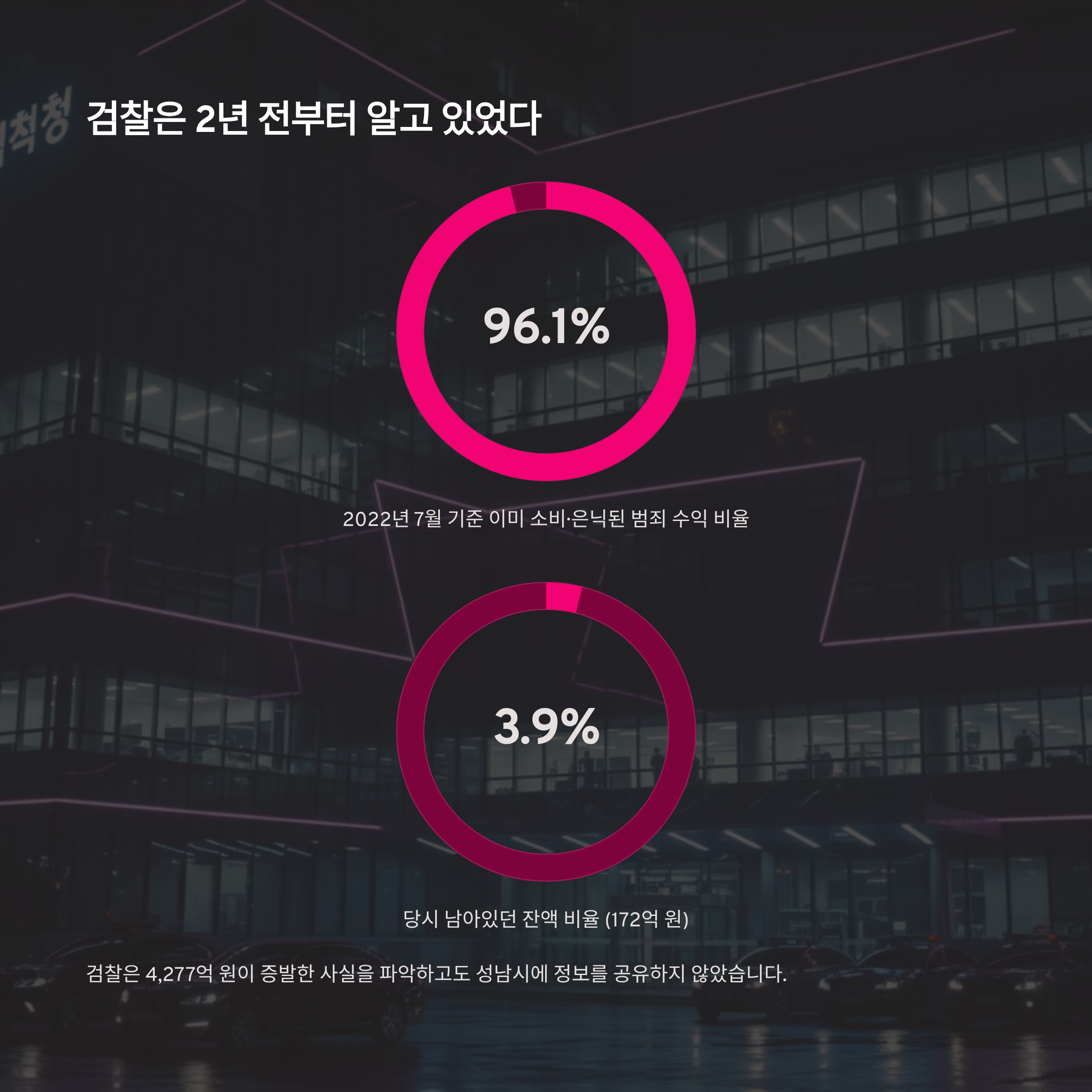 이번 사태를 더욱 심각하게 만드는 것은 대한민국 검찰의 태도입니다. 성남시가 확보한 수사 기록에 따르면, 검찰은 이미 2022년 7월 말을 기준으로 전체 추정 범죄 수익 4,449억 원 중 무려 96.1%에 해당하는 4,277억 원이 소비되거나 은닉되어 계좌를 빠져나간 사실을 파악하고 있었습니다. 당시 남은 잔액은 전체의 3.9%인 172억 원에 불과했습니다. 즉, 검찰은 2년 전부터 대장동 자금이 사실상 증발했다는 사실을 알고 있었던 셈입니다.