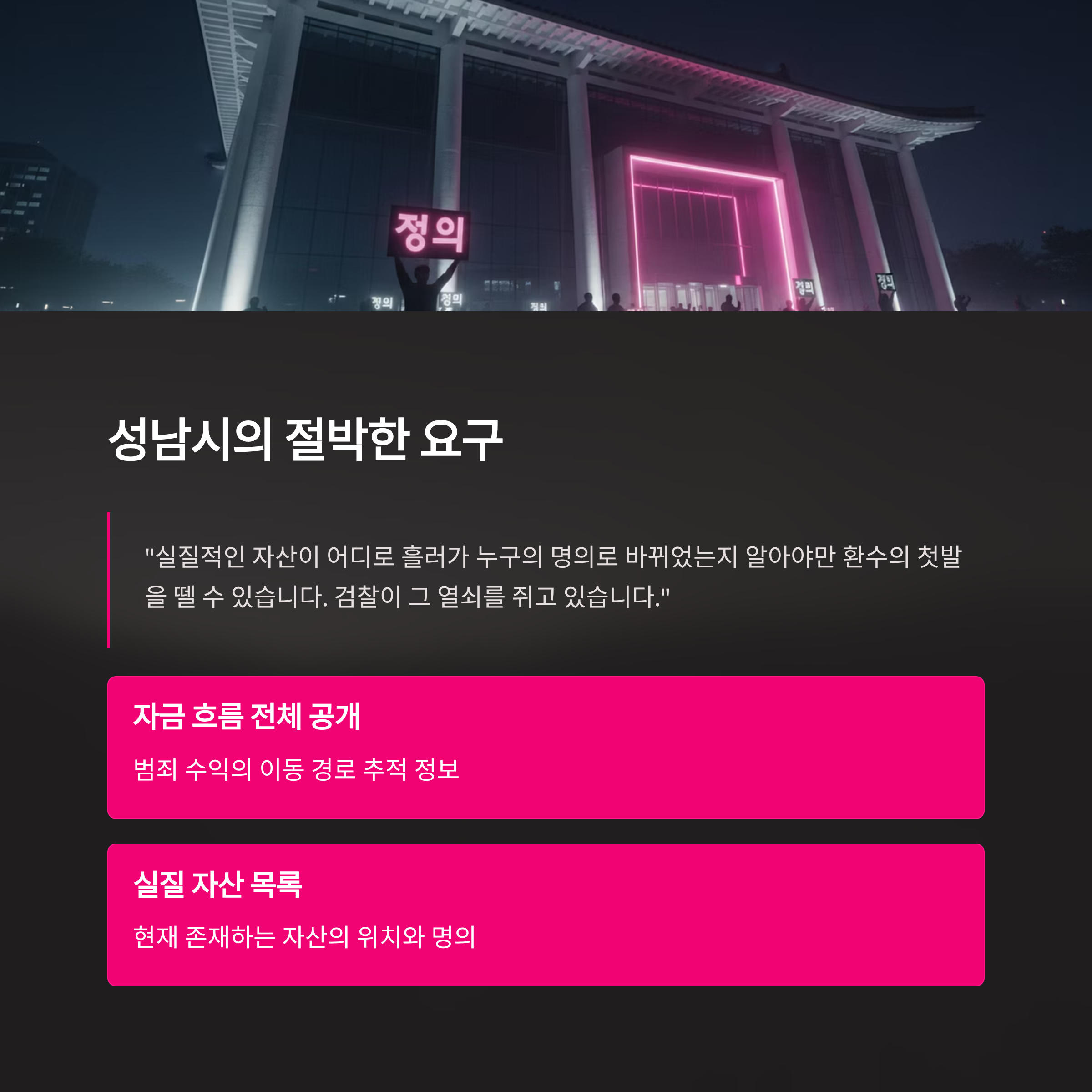 해외 송금이나 가상자산 구매 등을 통해 국외로 빼돌렸을 가능성도 배제할 수 없습니다. 이런 상황에서 단순히 계좌 번호만 묶는 가압류는 아무런 의미가 없습니다. 성남시가 검찰에 자금 흐름 전체에 대한 정보 공유를 절박하게 요구하는 이유가 바로 여기에 있습니다. 실질적인 자산이 어디로 흘러가 누구의 명의로 바뀌었는지 알아야만 환수의 첫발을 뗄 수 있는데, 검찰이 그 열쇠를 쥐고 문을 열어주지 않고 있는 형국입니다.