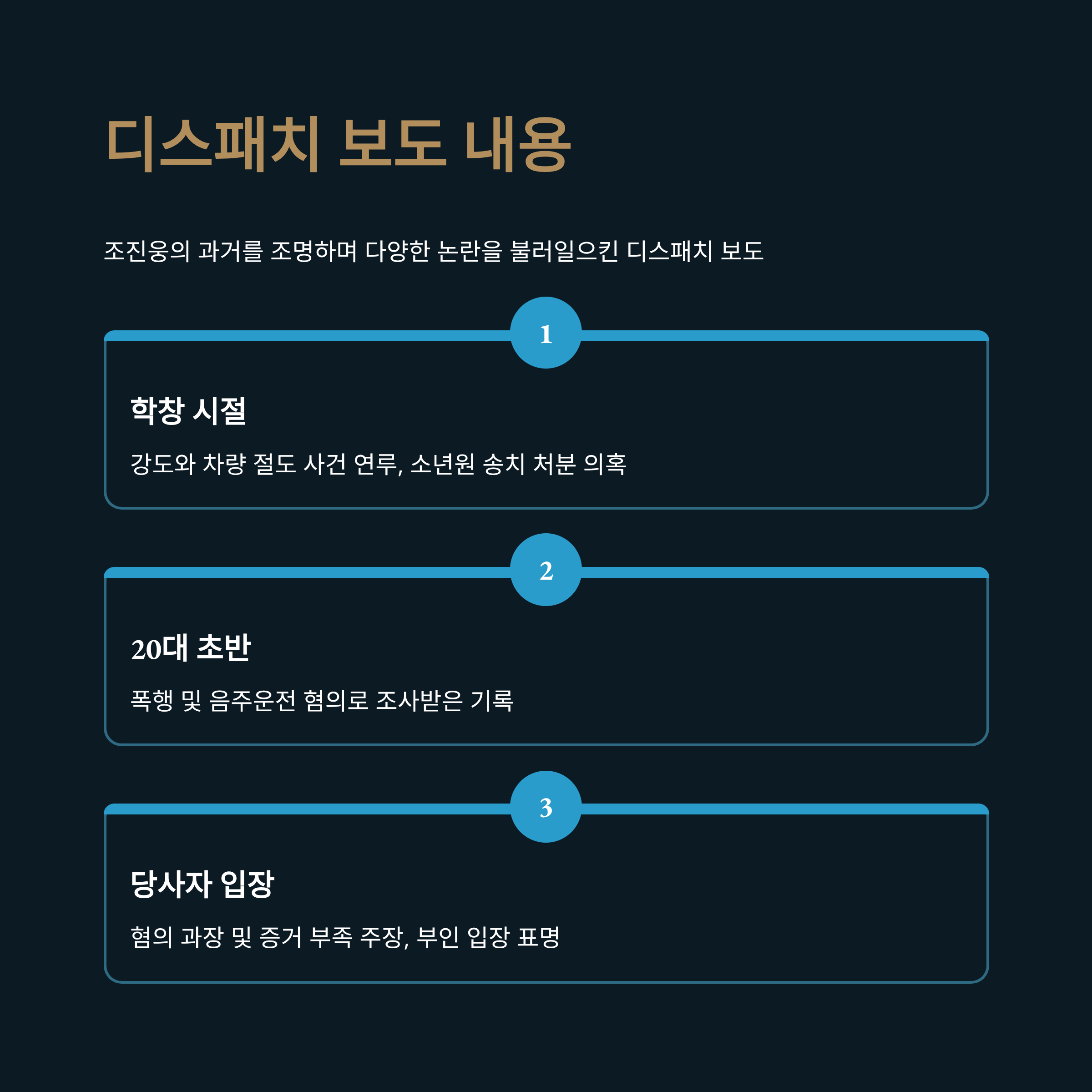 디스패치의 보도는 조진웅의 과거를 조명하며 다양한 논란을 불러일으켰습니다. 보도 내용에 따르면 그는 10대 시절, 학창 시절 강도와 차량 절도 사건에 연루된 적이 있으며, 이로 인해 소년원 송치라는 처분을 받았다는 의혹이 제기되었습니다. 이를 통해 대중은 조진웅의 개명 이유와 초기 학창 시절의 불분명한 행적에 대해 더욱 큰 관심을 갖게 되었습니다. 또한 조진웅이 20대 초반에 폭행 및 음주운전 혐의로도 조사를 받은 적이 있다는 점은 그의 과거 행적 논란에 불을 지폈습니다.