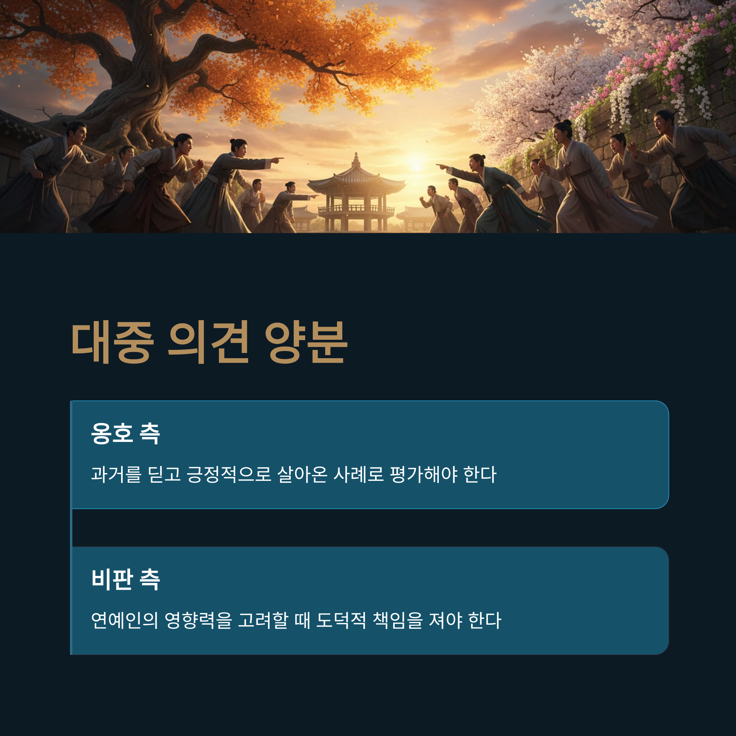이와 관련해 대중의 주장은 크게 갈립니다. 일부 팬들은 "과거를 딛고 긍정적으로 살아온 사례로 봐야 한다"고 옹호하는 반면, 또 다른 쪽은 "사회적 모범이 되어야 할 연예인의 영향력을 감안할 때 도덕적 책임을 져야 하는 것이 아니냐"며 비판합니다. 논란의 중심에서 당사자인 조진웅은 현재 명확한 추가 입장을 내놓지 않고 침묵으로 일관하고 있습니다.
