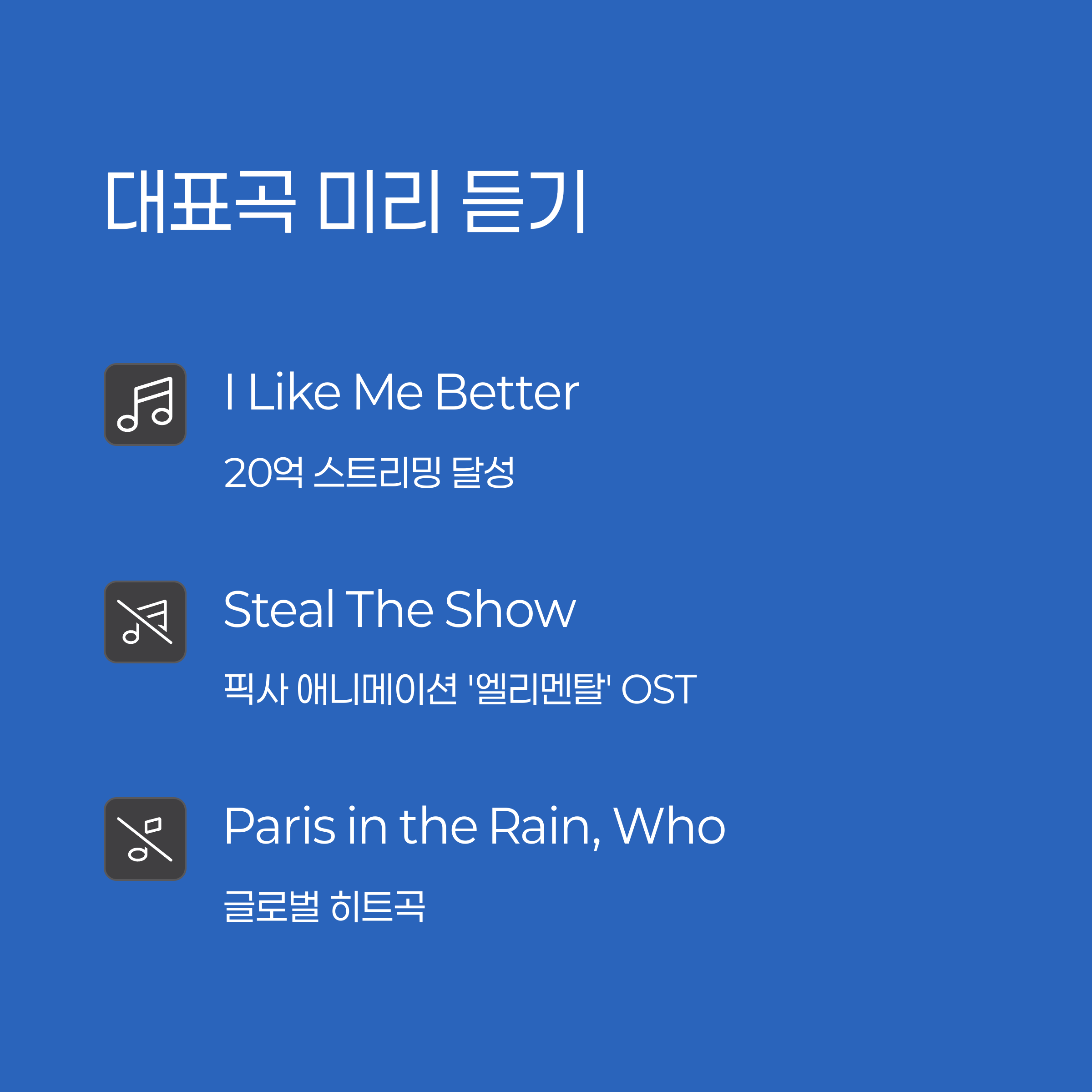 4. 대표곡: 'I Like Me Better', 'Steal The Show' 등 다수