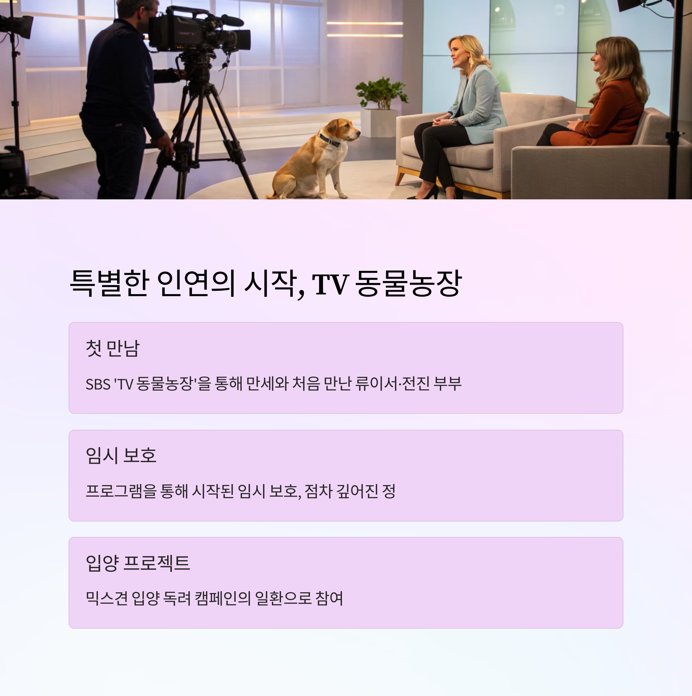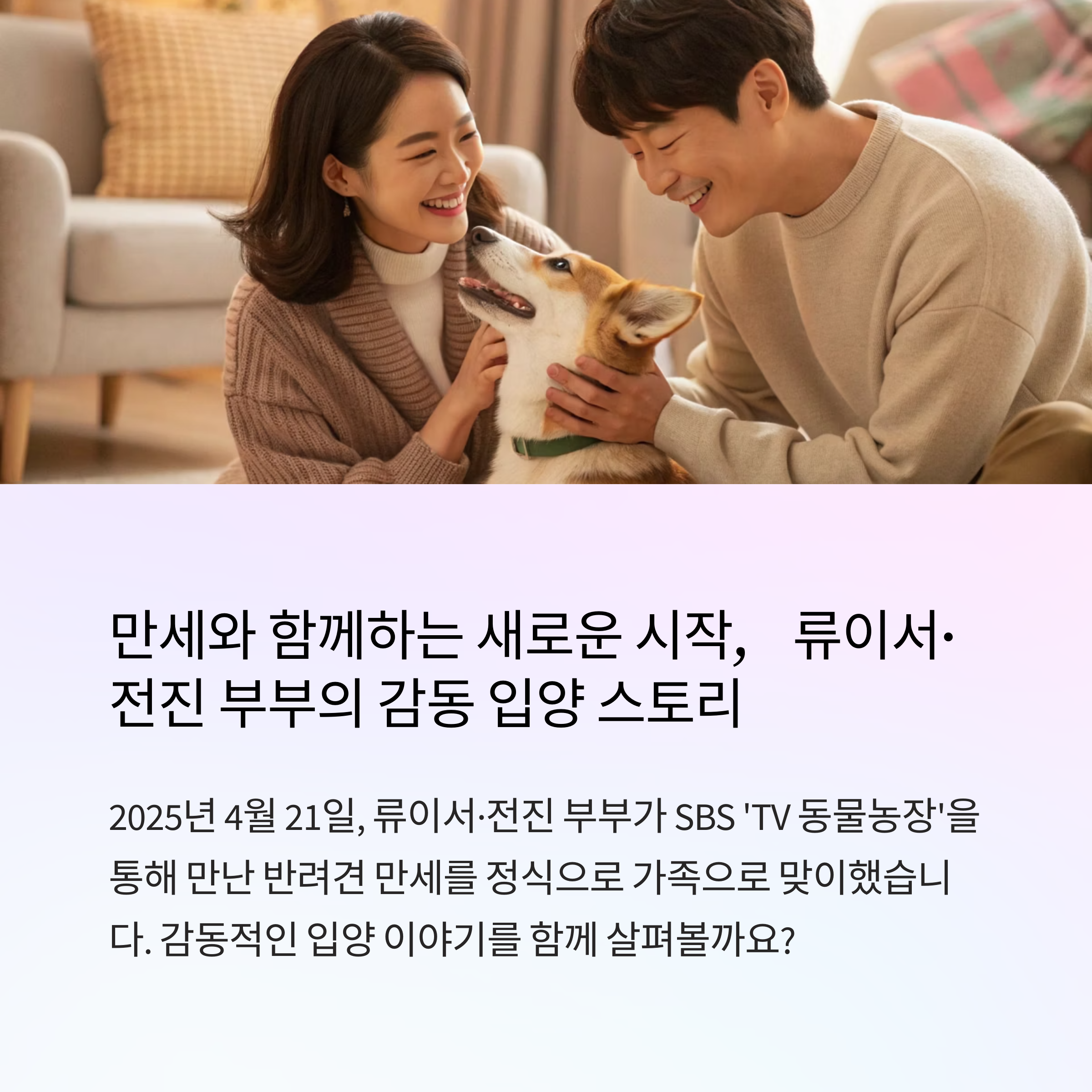 | A. 류이서와 전진 부부는 SBS 'TV 동물농장'에 출연하며 반려견 만세를 만나게 되었고, 따뜻한 마음으로 입양을 결심하게 되었습니다. 이는 부부가 가족의 의미를 한층 넓히는 계기가 되었습니다. |