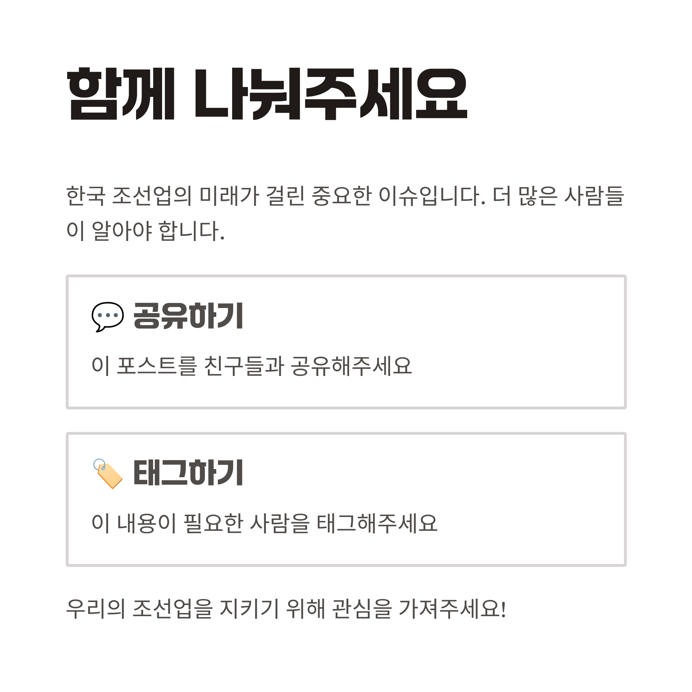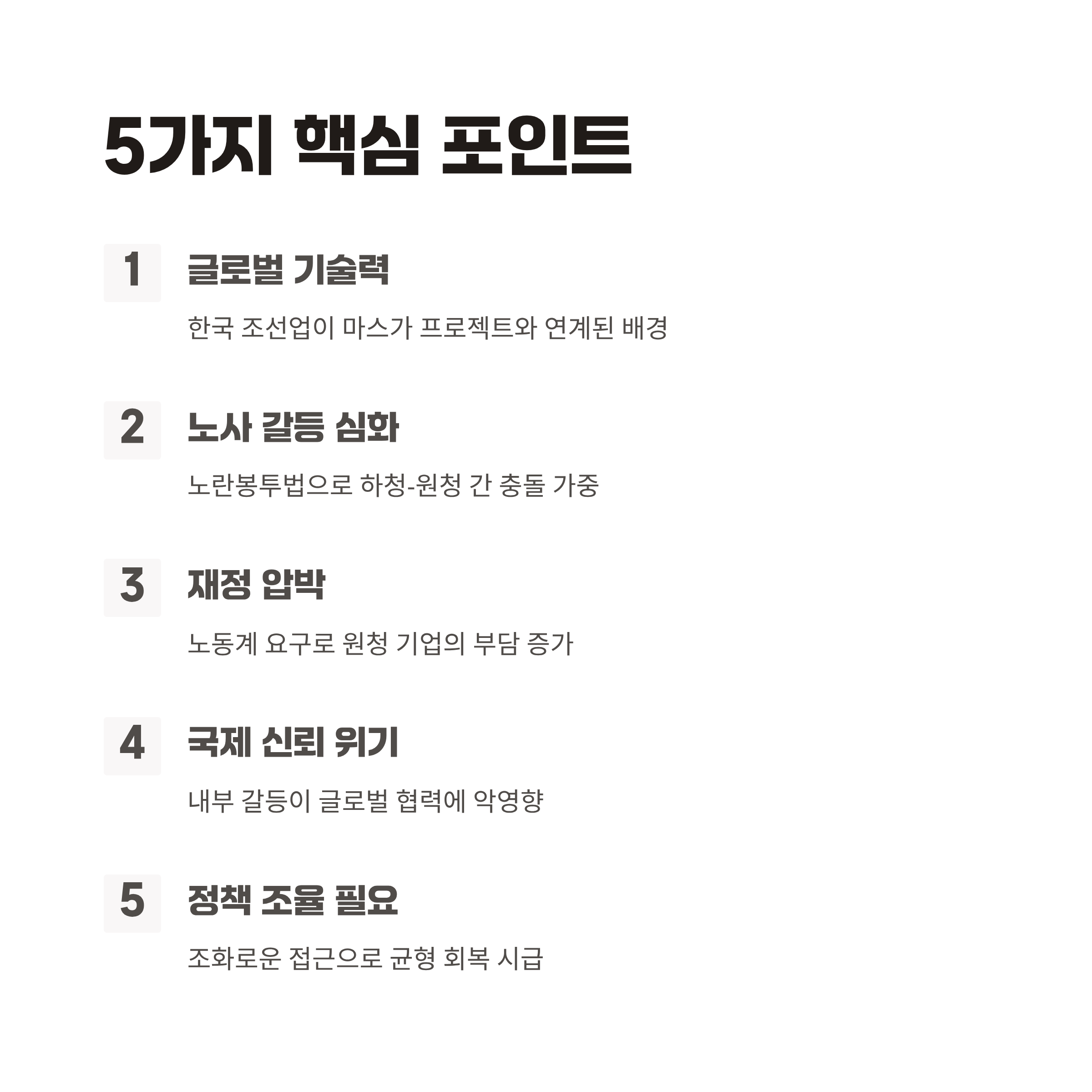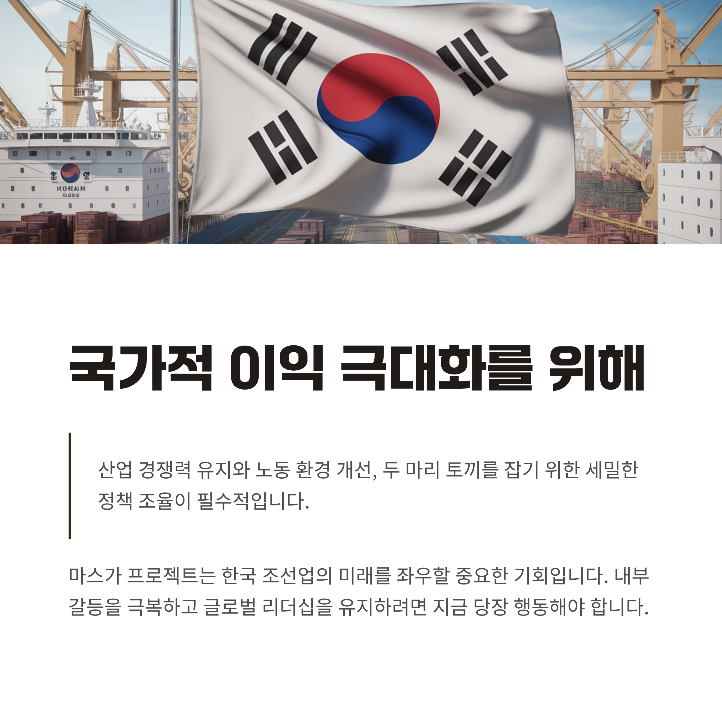 관련 태그: 한국 조선업, 마스가 프로젝트, 노란 봉투법, 노동 갈등, 국제 협력, 산업 경쟁력, 기술력, 노동 정책, 경제 대책