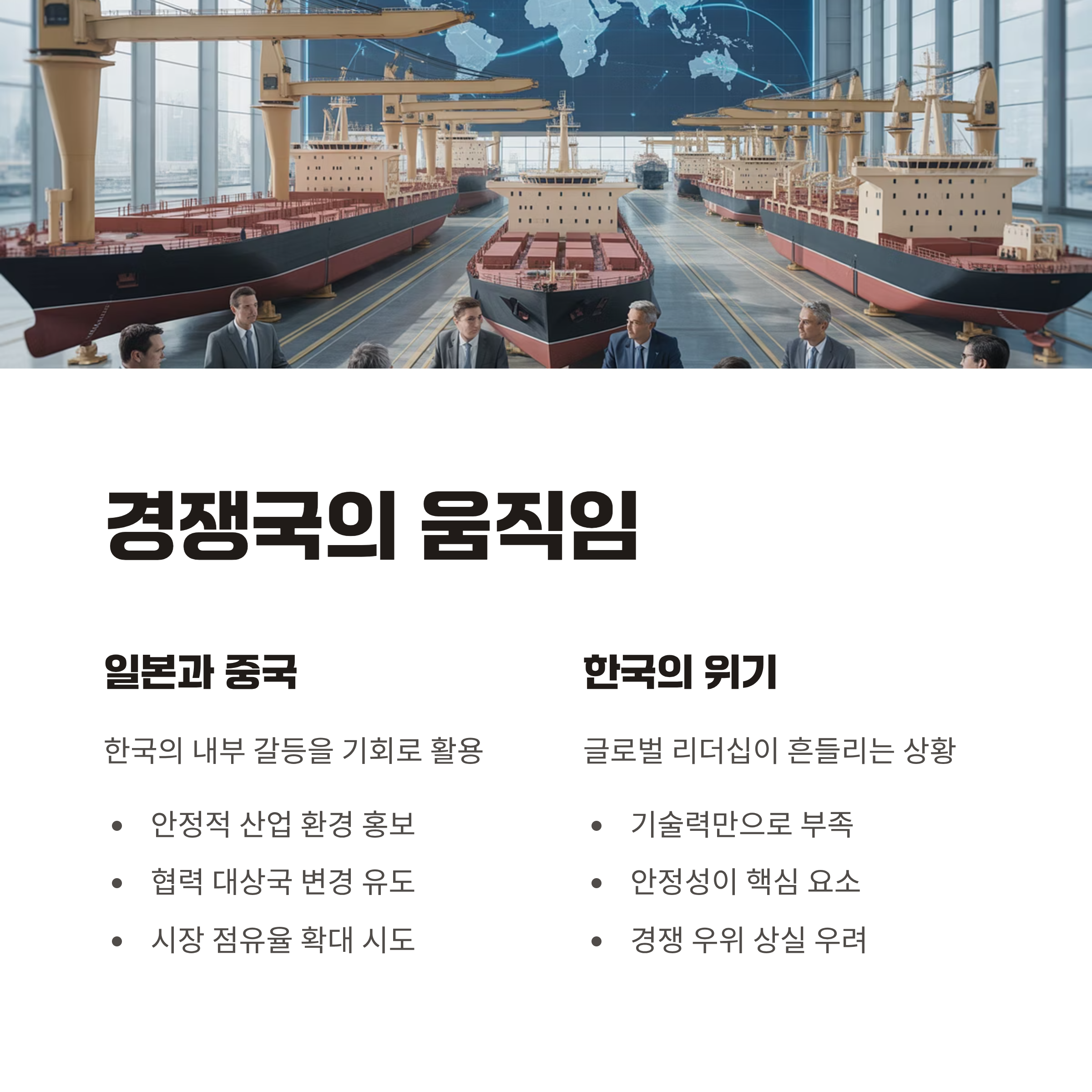 또한, 일본과 중국 등 경쟁국은 이를 기회로 삼아 기술력뿐 아니라 더 안정적인 산업 환경을 홍보하며 협력 대상국 변경을 유도하고 있습니다. 이러한 상황은 한국 조선업의 글로벌 리더십이 흔들리는 결과를 초래할 수 있습니다.