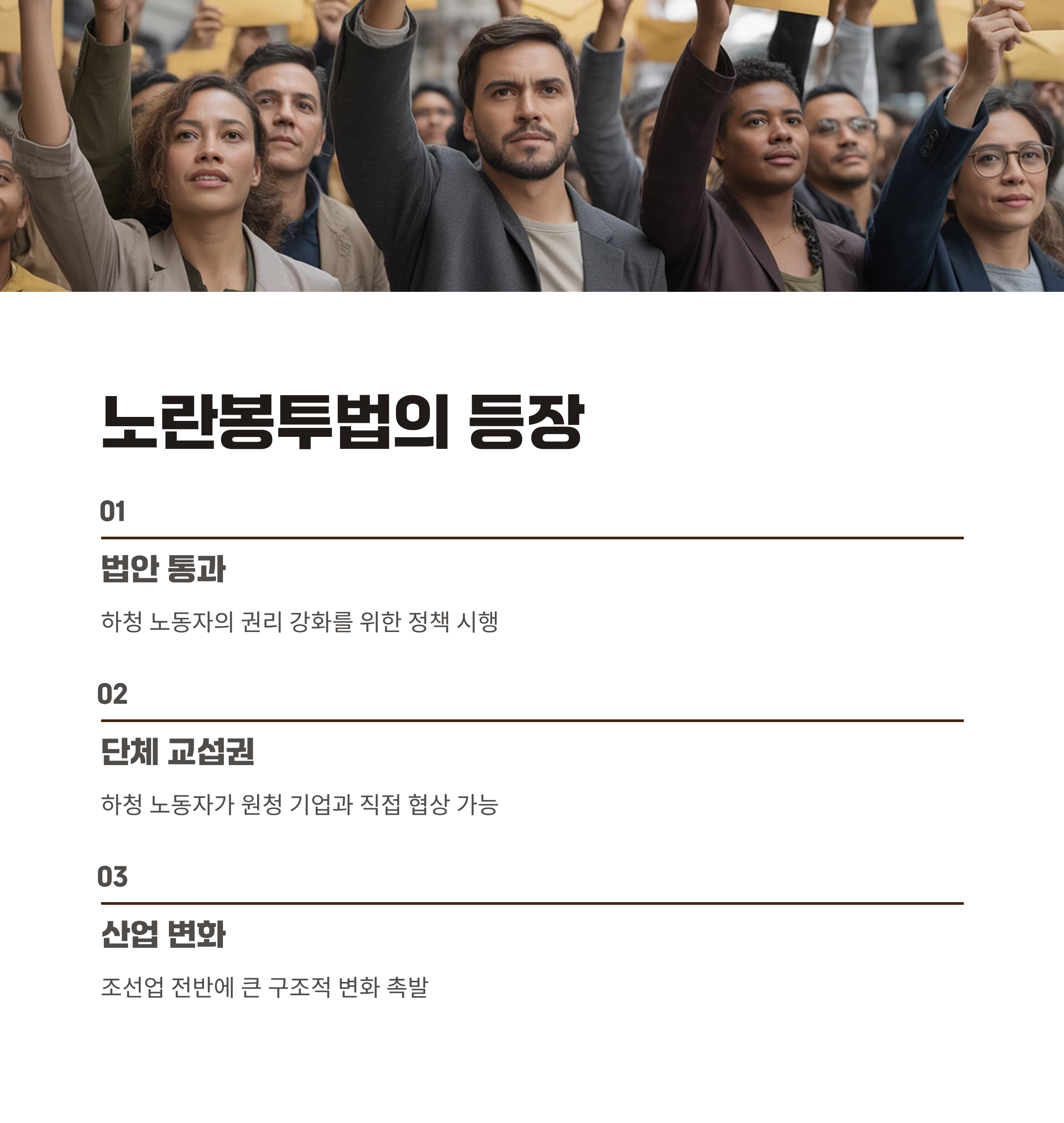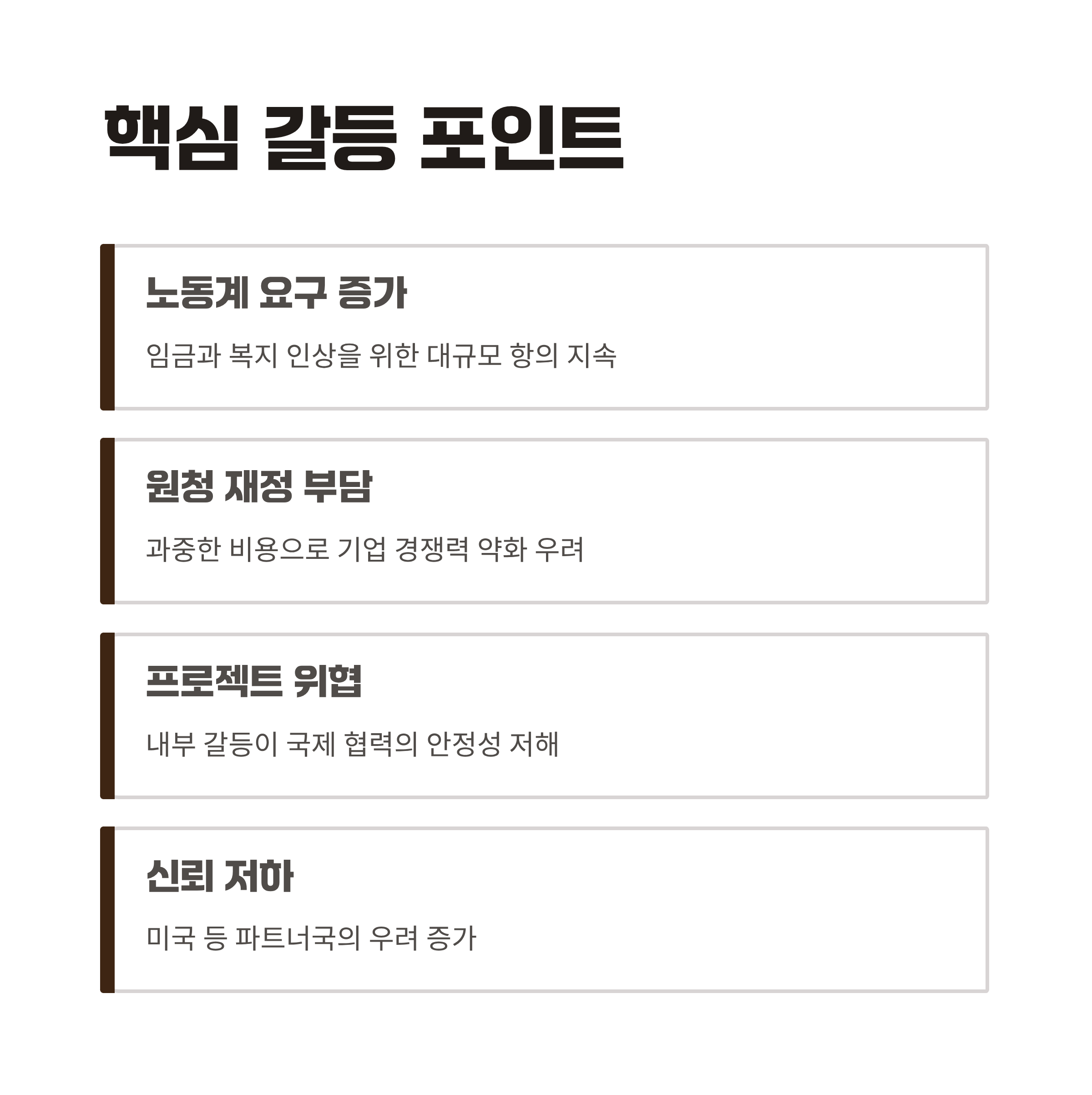 하지만, 최근 노란 봉투법이라는 정책이 통과되면서 하청 노동자의 권리 강화가 산업 전반에 큰 변화를 촉발시키고 있습니다. 원청 기업 및 정부와의 갈등 항목이 늘어나며, 중요한 국제 협력 프로젝트 자체의 안정성을 흔드는 위협으로 작용하고 있다는 우려가 커지고 있습니다.