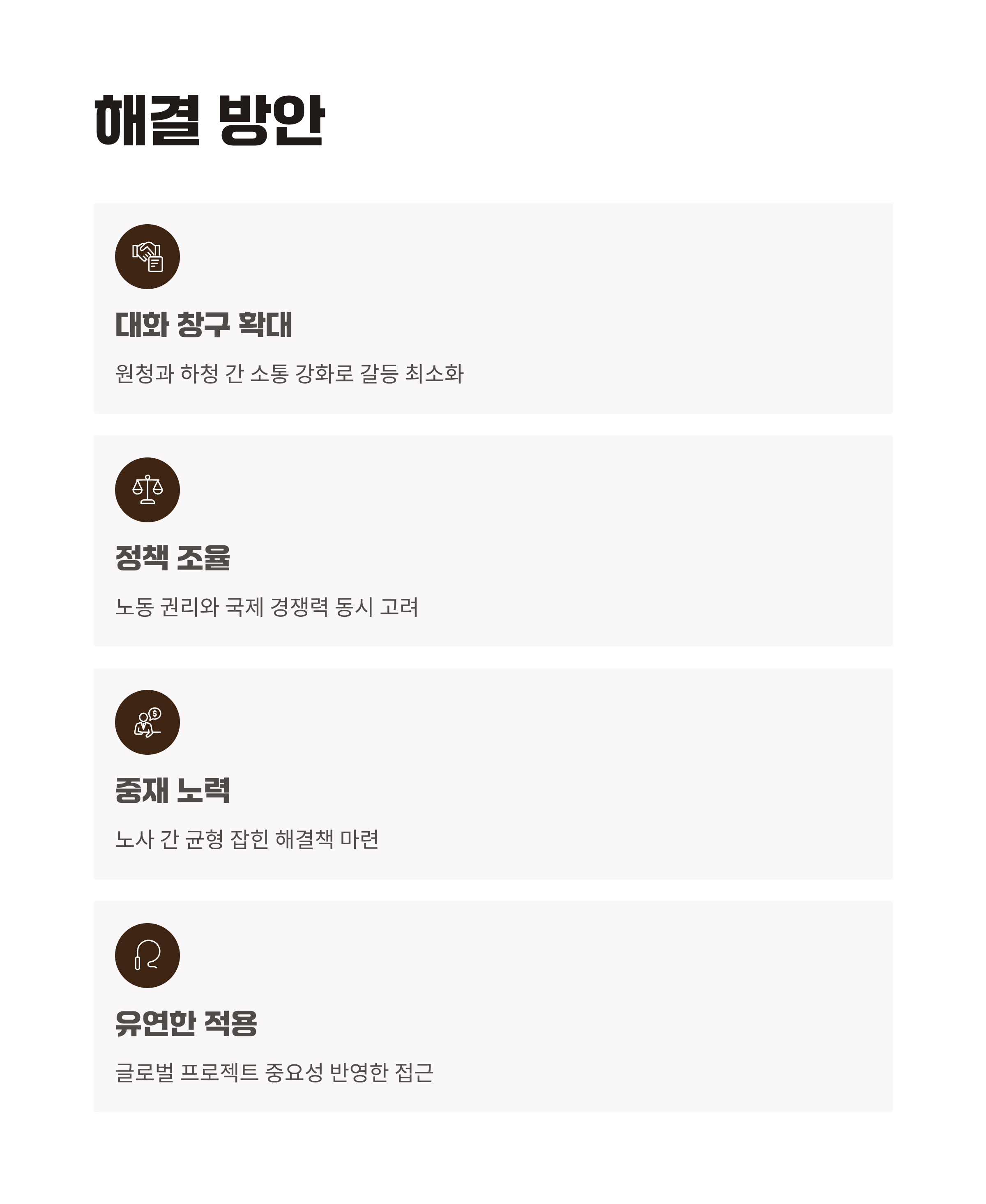현재 상태를 극복하기 위해, 원청과 하청 간의 대화 창구 확대 및 갈등 최소화를 위한 중재 노력이 필요합니다. 더불어, 글로벌 프로젝트의 중요성을 고려한 법과 정책의 유연한 적용을 통해 국가적 이익을 극대화하는 노력이 뒤따라야 할 것입니다.