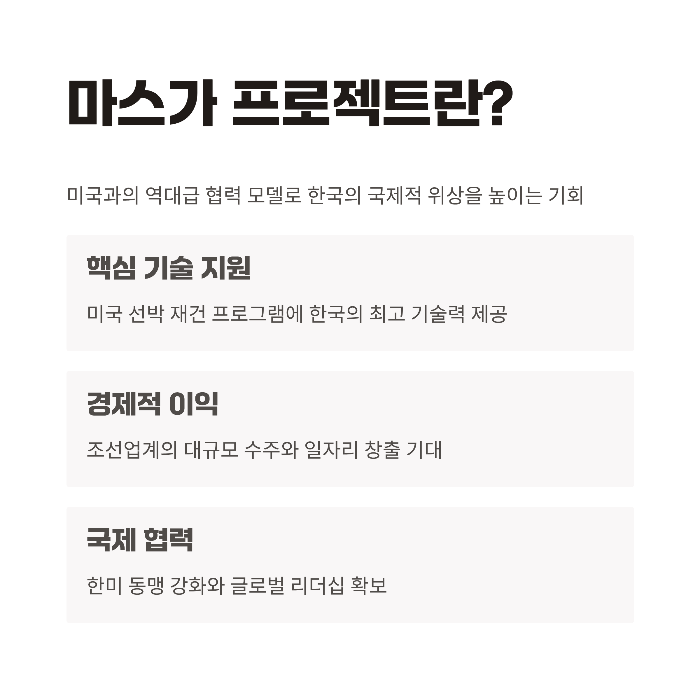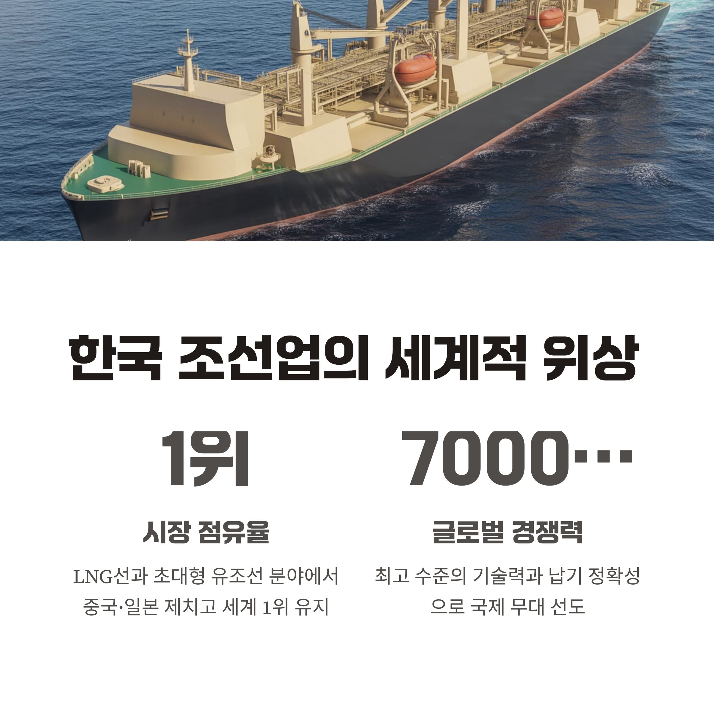 한국 조선업은 세계 무대에서 높은 기술력과 경쟁력을 자랑합니다. 특히, 일본과 중국으로 대표되는 아시아 조선업 강대국들과의 치열한 경쟁 속에서도 높은 품질과 납기 정확성으로 두각을 나타내고 있습니다. 이에 한국 정부는 미국과의 협력을 통해 '마스가 프로젝트'라는 역대급 협력 모델을 추진 중입니다. 이 프로젝트는 단순히 조선업계의 경제적 이익만이 아니라, 대한민국의 국제적 위상을 높이는 기회를 줄 것으로 여겨지고 있습니다.
