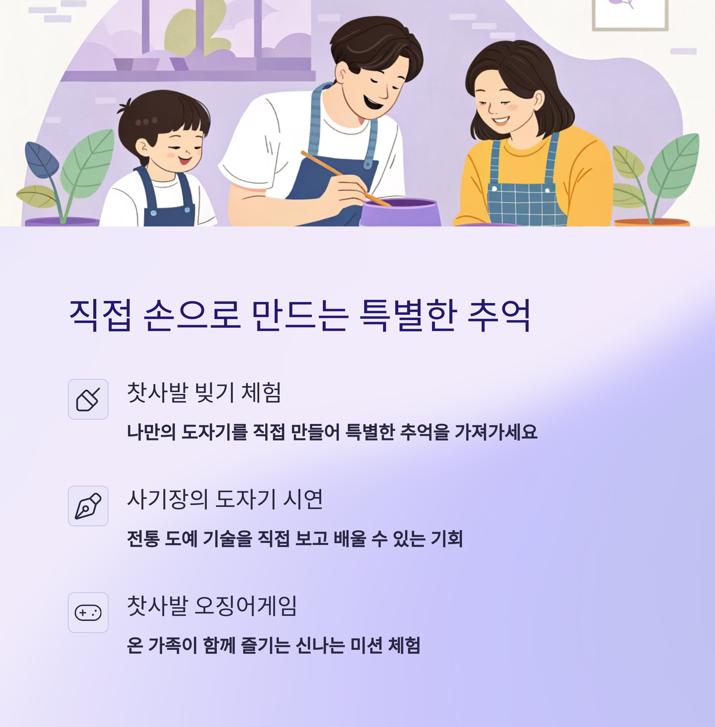 | 찻사발 빚기 체험 | 매일 | 체험관 | 가족 체험 가능 |