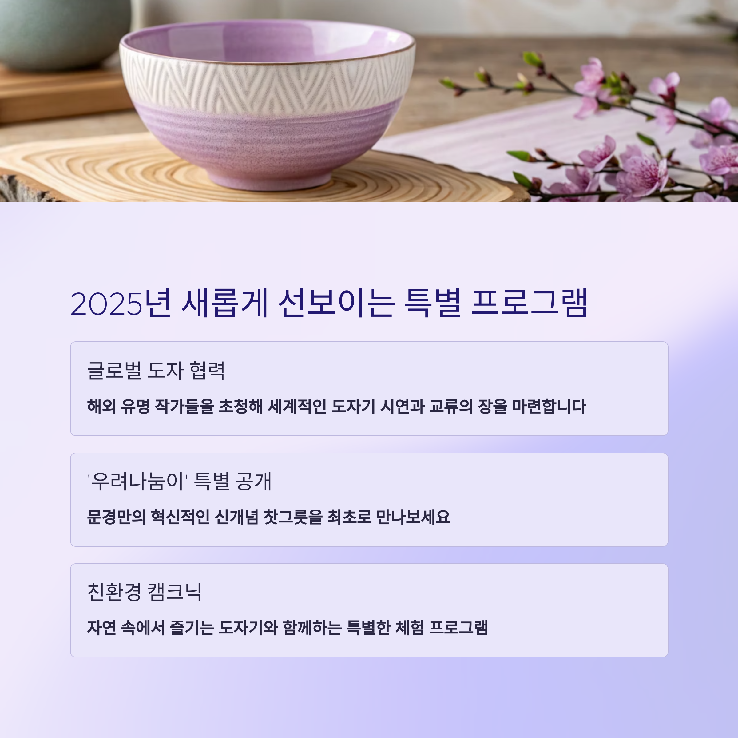 이번 축제는 2025년 5월 3일부터 5월 11일까지 열리며 다채로운 전통 문화와 현대의 생활자기를 한자리에서 만나볼 수 있는 훌륭한 행사입니다.