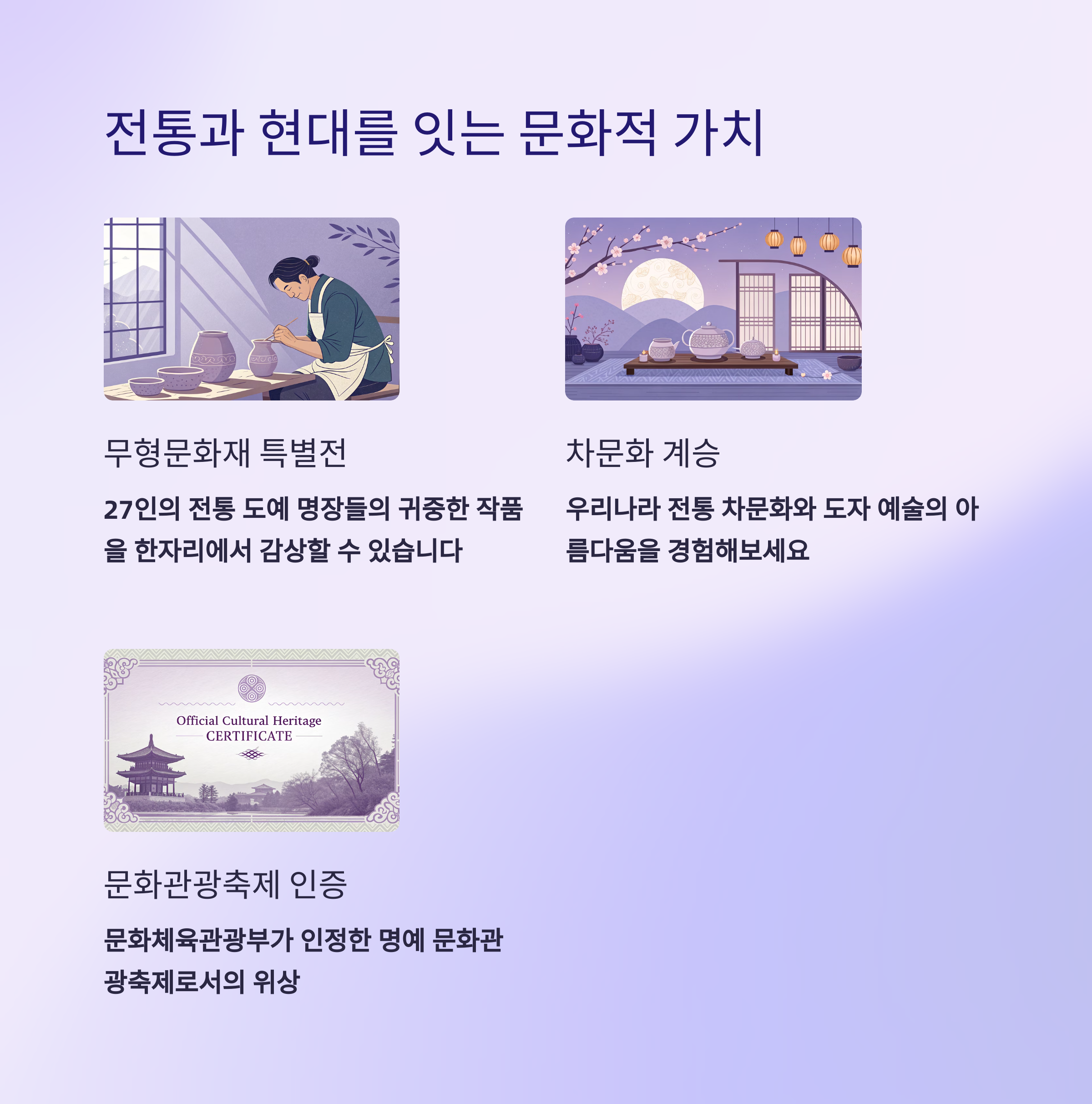 전통 다도 체험과 도예 기술 시연 등 다양한 프로그램으로 문화를 더 가까이 느낄 수 있는 기회를 제공합니다.
