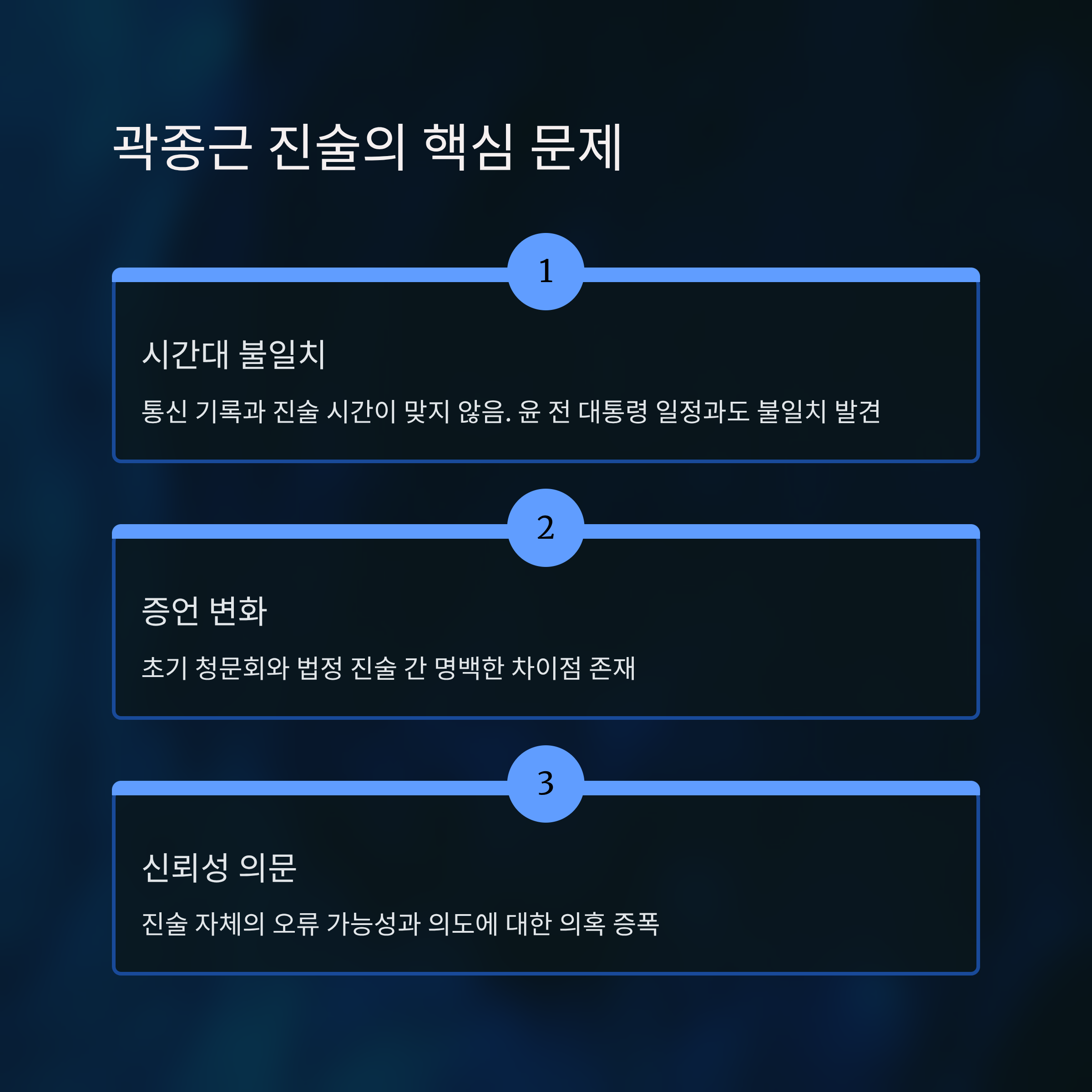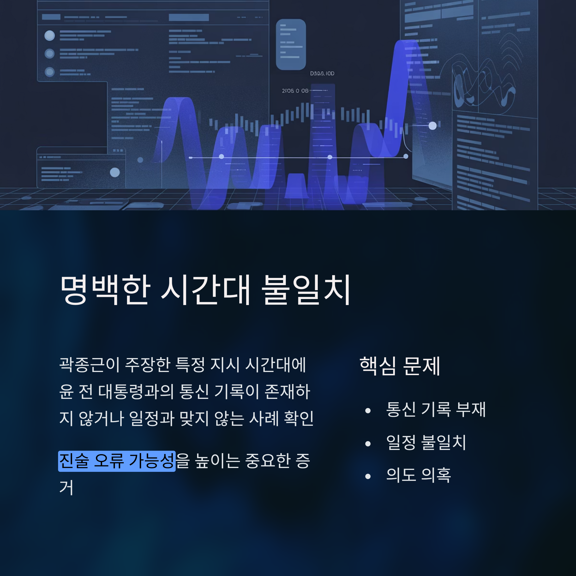 | A. 곽종근의 주장과 통신 기록 간 명백한 시간대 불일치 및 증언의 변화로 인해 신뢰성 문제가 제기되었습니다. 특히, 그의 초기 발언과 법정 진술 간의 차이점이 논란의 중심에 있습니다. |