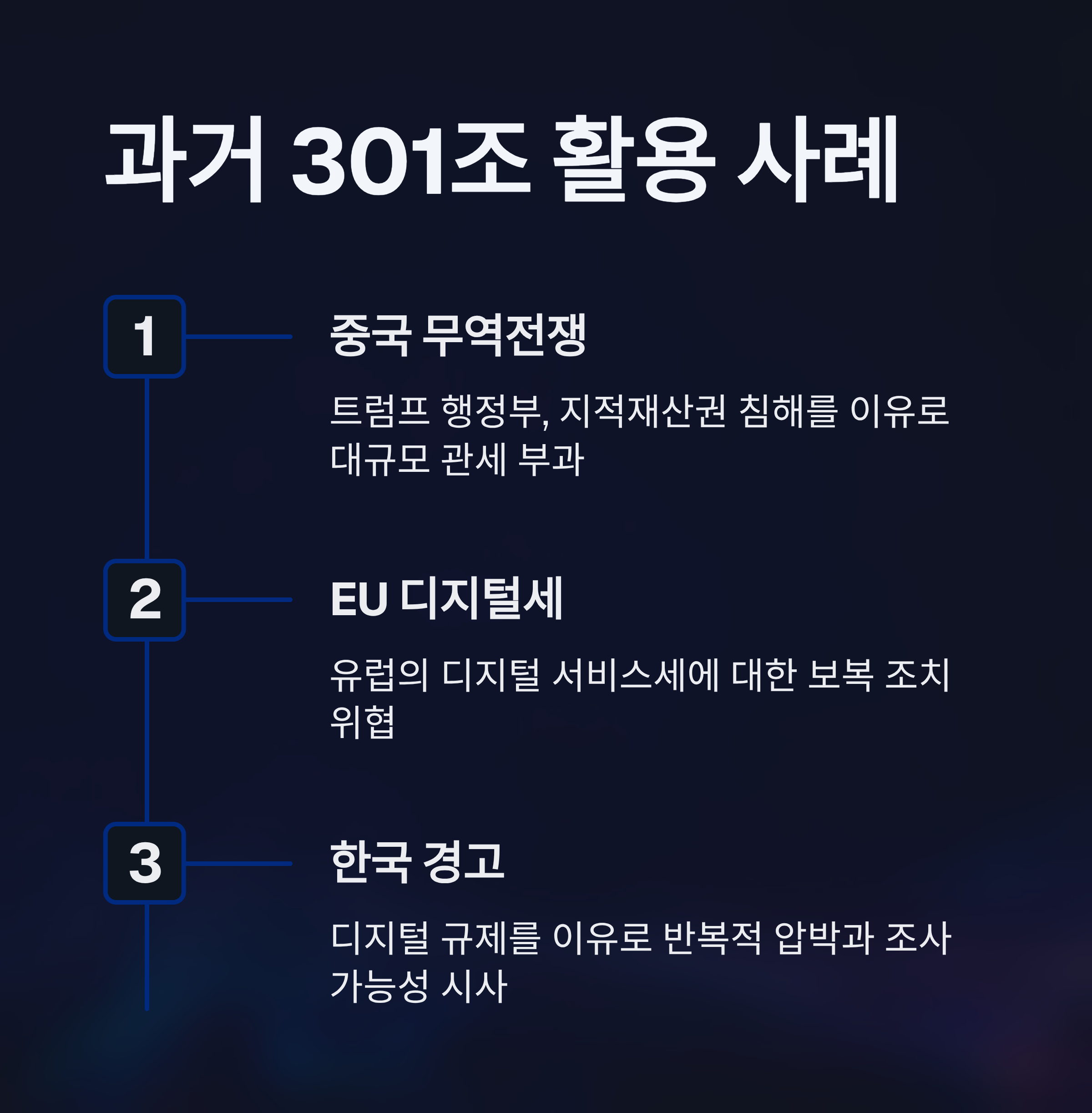 1. 미국은 한국이 디지털 서비스 관련 자국 빅테크 기업에 불리한 규제를 추진하면 무역법 301조 조사를 개시할 수 있다고 반복 경고하고 있습니다.
