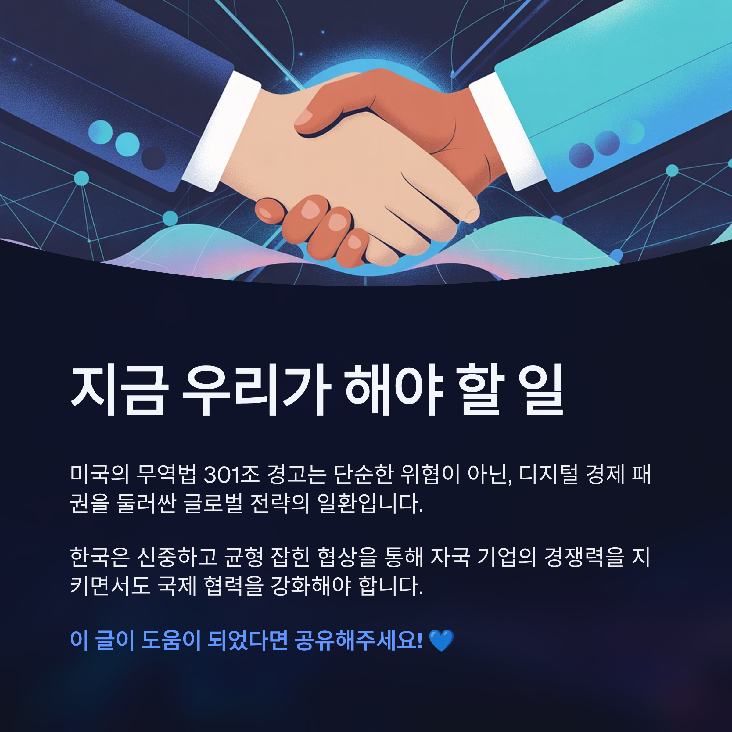 미국의 무역법 301조 경고는 단순히 통상문제 해결 수단이 아닌, 디지털 경제를 선점하려는 전략적 도구임을 이해해야 합니다. 동시에 한국은 단기적 대응책을 넘어 노골적인 경제적 불균형을 완화하고 자국 기업의 국제 경쟁력을 유지하기 위한 정책 조율이 필요합니다.