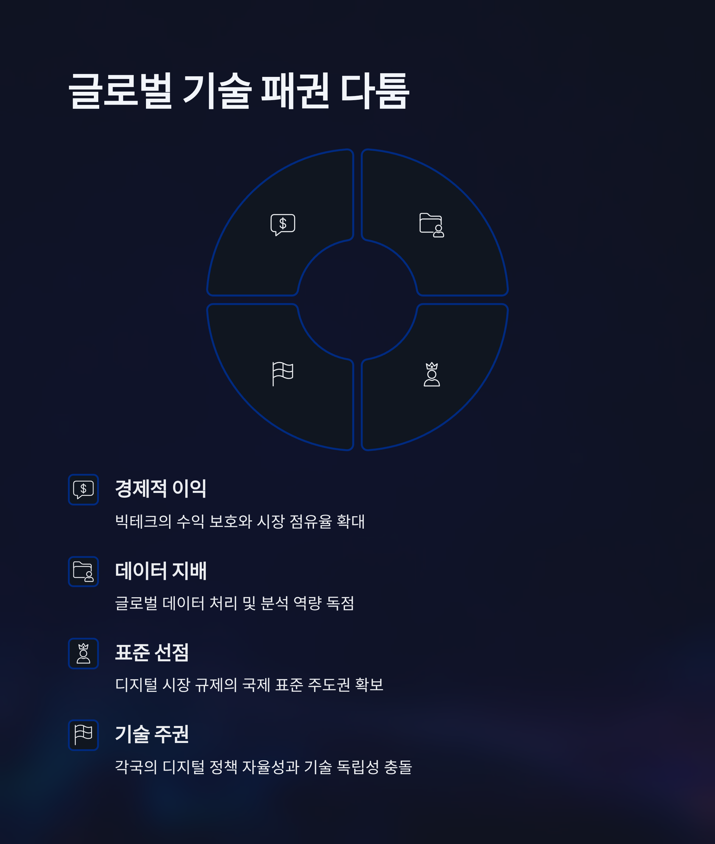 이와 함께 한미 디지털 규제의 충돌은 더 나아가 글로벌 기술 패권 다툼으로 번지고 있습니다. 데이터 국경 간 이동의 자유 보장은 미국 빅테크에게 글로벌 데이터 처리와 분석 역량을 극대화할 수 있는 기회를 제공하는 반면, 한국 로컬 기업에게 정책적 경쟁력을 저하시킬 위험성을 내포합니다. 글로벌 경제의 연결 속에서 자국 중심적 디지털 정책을 실행하기 위한 전략 설계의 중요성이 대두됩니다.