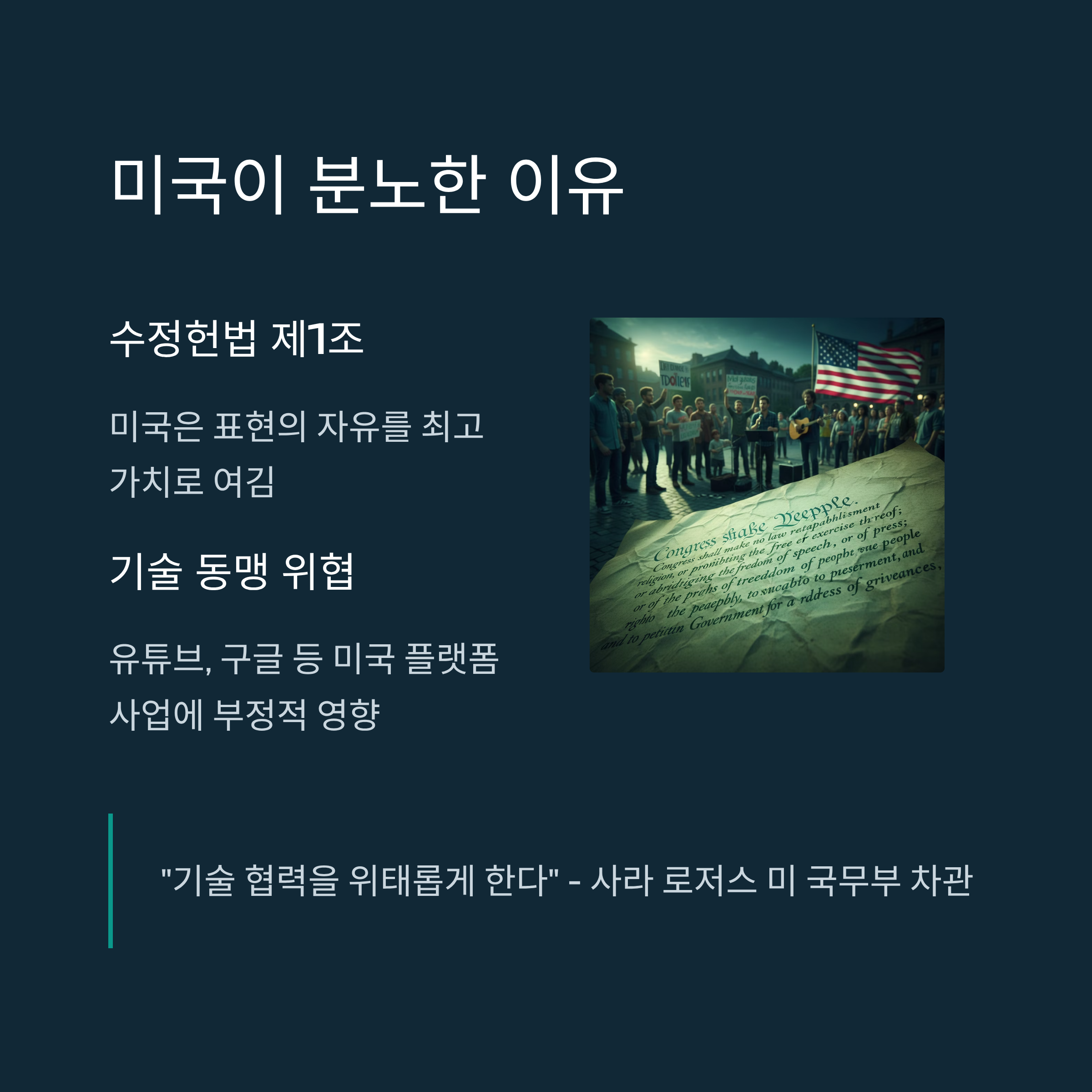 미국은 수정헌법 제1조를 통해 '표현의 자유'를 최고의 가치로 여깁니다. 미국 측은 이번 법안이 유튜브나 구글과 같은 미국 기반 플랫폼의 사업에 부정적 영향을 미치고, 나아가 글로벌 디지털 생태계의 자유로운 흐름을 저해한다고 보고 있습니다. 사라 로저스 미 국무부 차관이 SNS를 통해 "기술 협력을 위태롭게 한다"고 직접 언급한 것은, 이 법안이 단순한 국내법 개정을 넘어 한미 간 기술 동맹의 균열을 초래할 수 있음을 경고한 것입니다.