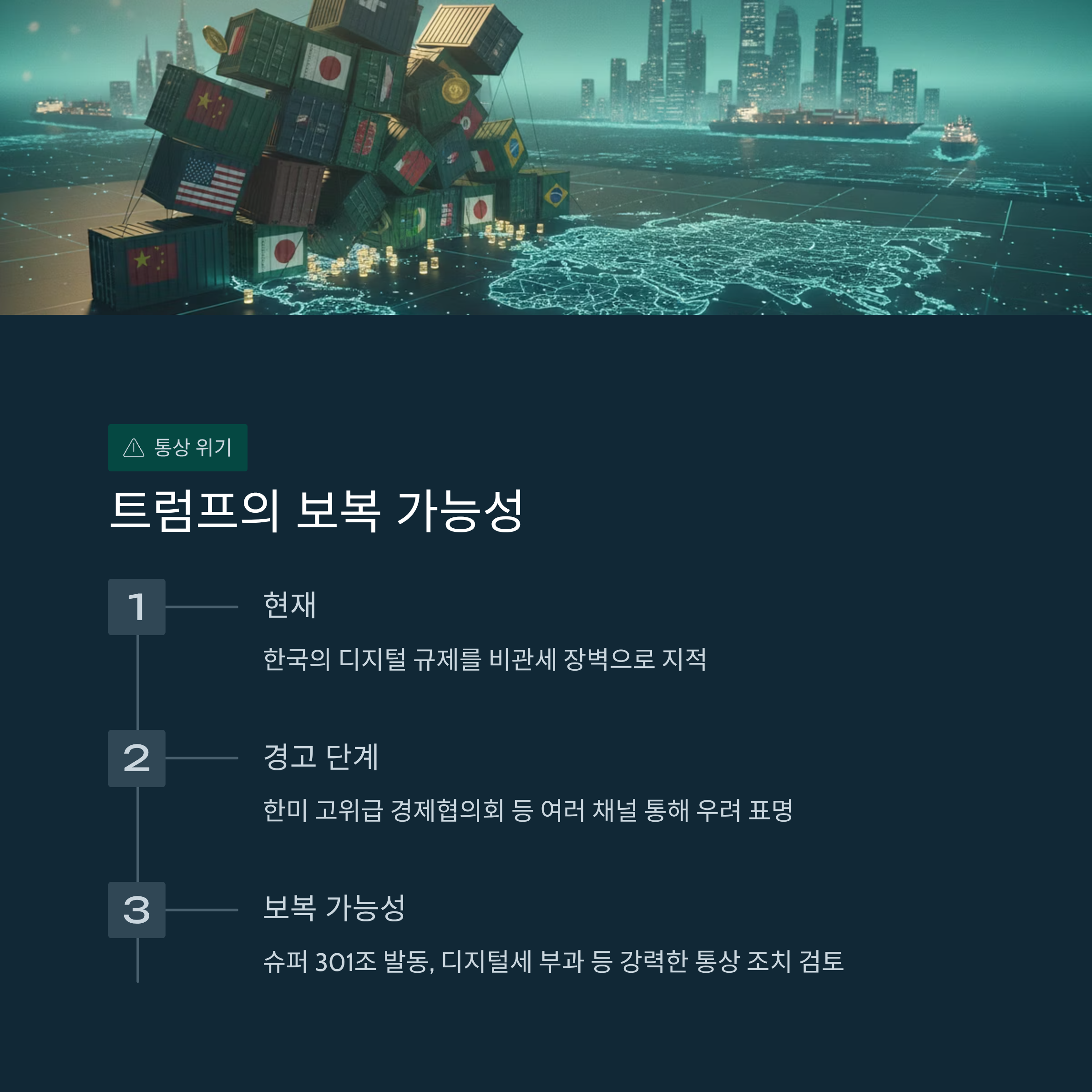 현재 미국의 트럼프 행정부는 자국 우선주의를 바탕으로 강력한 보호무역 정책을 펼치고 있습니다. 이러한 상황에서 한국의 디지털 규제 강화는 미국에게 좋은 먹잇감이 될 수 있습니다. 미국은 이미 한미 고위급 경제 협의회 등 여러 채널을 통해 한국의 입법 조치가 무역 합의에 어긋나는 '비관세 장벽'임을 지적해 왔습니다. 특히 중국 기업들이 반사 이익을 얻는 구조 속에서 미국 기업만 규제하는 형국은 트럼프 대통령의 심기를 건드릴 수 있는 치명적인 요소입니다.