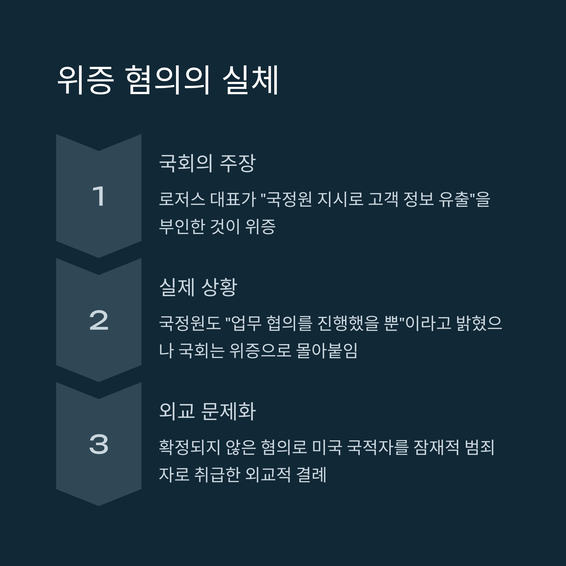 | 쿠팡 사태 | 국정원 지시 은폐 및 청문회 위증, 불출석에 대한 법적 처벌 필요 | 확정되지 않은 혐의로 미국 국적자 소환 및 고발, 기업 활동 위축 우려 |