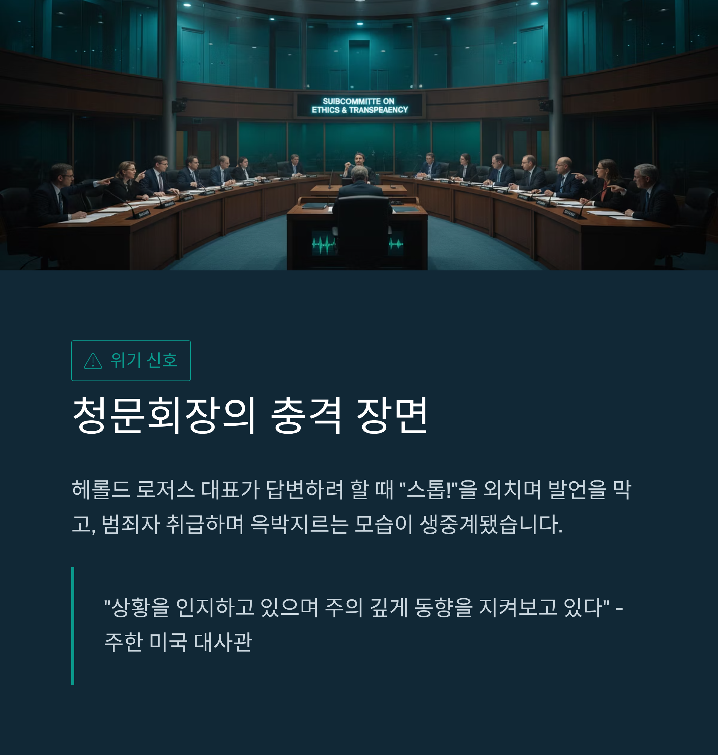 국회 과방위는 쿠팡의 헤롤드 로저스 임시 대표를 비롯한 임원들을 국회증언감정법 위반 혐의로 고발했습니다. 쟁점은 지난 청문회에서 로저스 대표가 "국정원 지시에 따라 고객 정보를 유출했다"는 의혹에 대해 "업무 협의를 했을 뿐 지시는 아니었다"고 답변한 부분입니다. 국정원 측이 "정보 수집을 위한 업무 협의를 진행했다"고 밝혔음에도, 국회는 이를 위증으로 몰아붙였습니다. 특히 청문회 과정에서 로저스 대표가 답변하려 할 때 "스톱(Stop)"을 외치며 발언을 막거나, 범죄자 취급을 하며 윽박지르는 모습은 고스란히 생중계되었습니다. 이는 한국 특유의 기업인 군기 잡기 식 태도가 미국 기업 임원에게도 그대로 적용된 사례입니다.