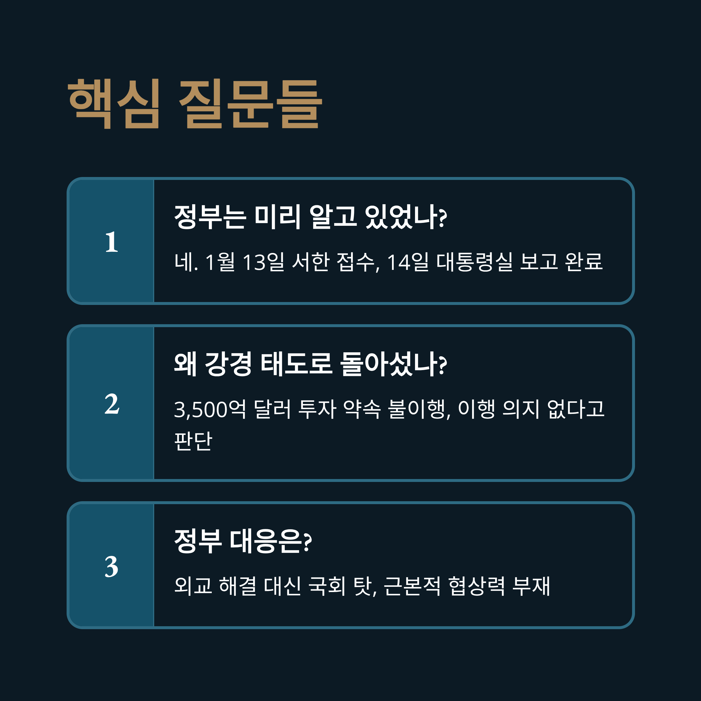 | A2. 작년 11월 합의한 '한미 공동 팩트 시트', 특히 3,500억 달러 규모의 대미 투자 약속이 지켜지지 않았기 때문입니다. 미국은 한국의 이행 의지가 없다고 판단했습니다. |