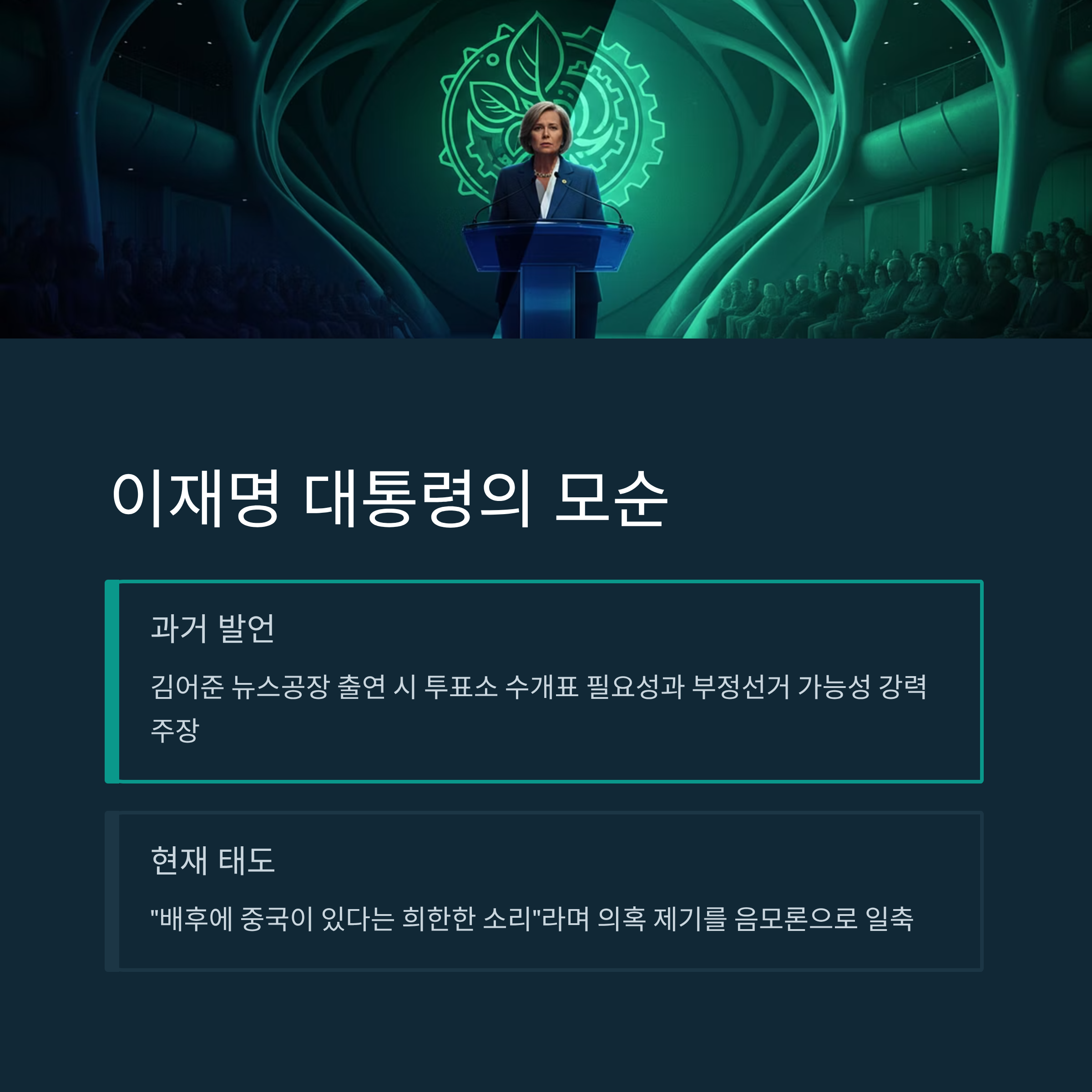 과거 부정선거 가능성을 언급했던 이재명 현 대통령이 현재 음모론으로 일축하는 태도를 보이면서, 이에 대한 비판이 제기되고 있습니다.