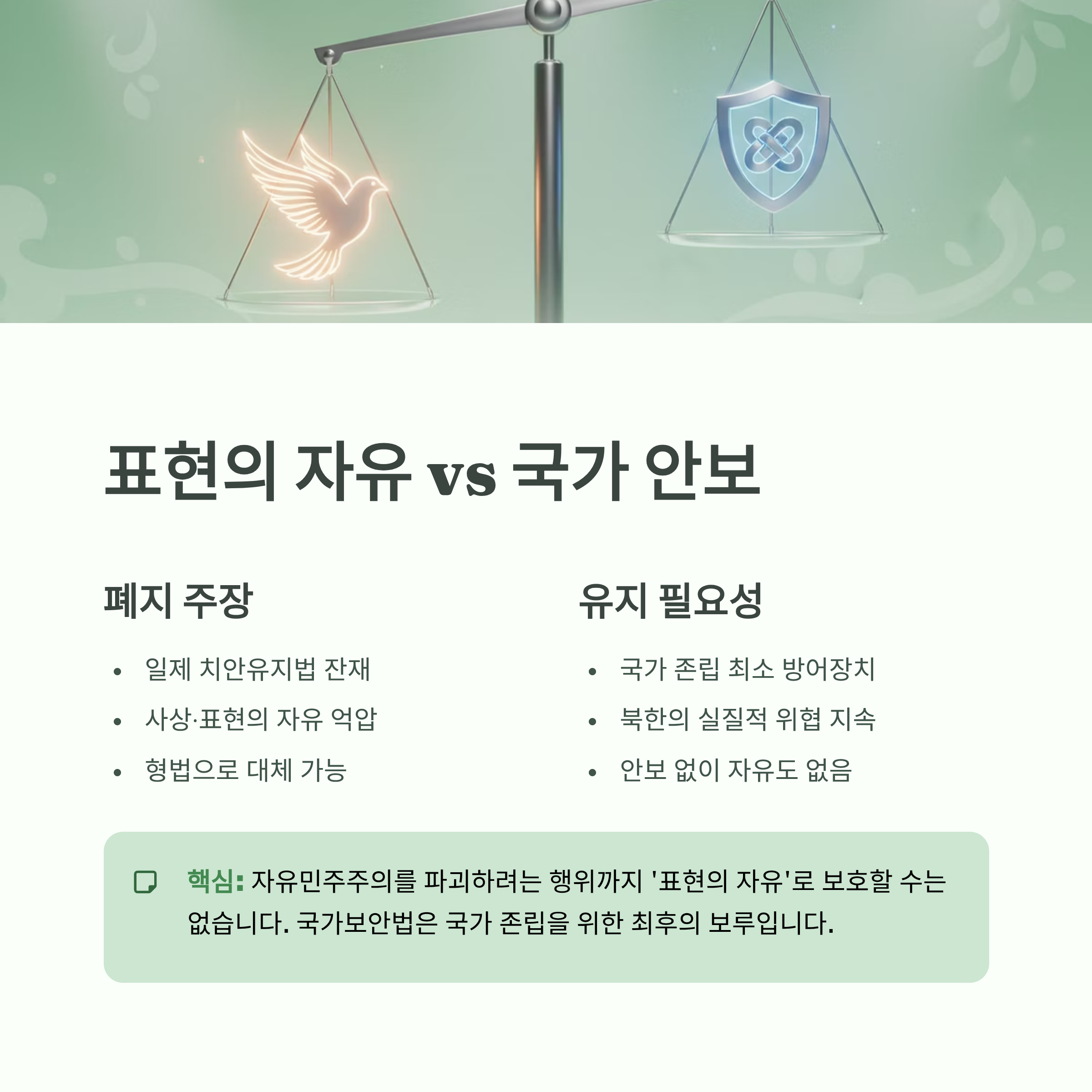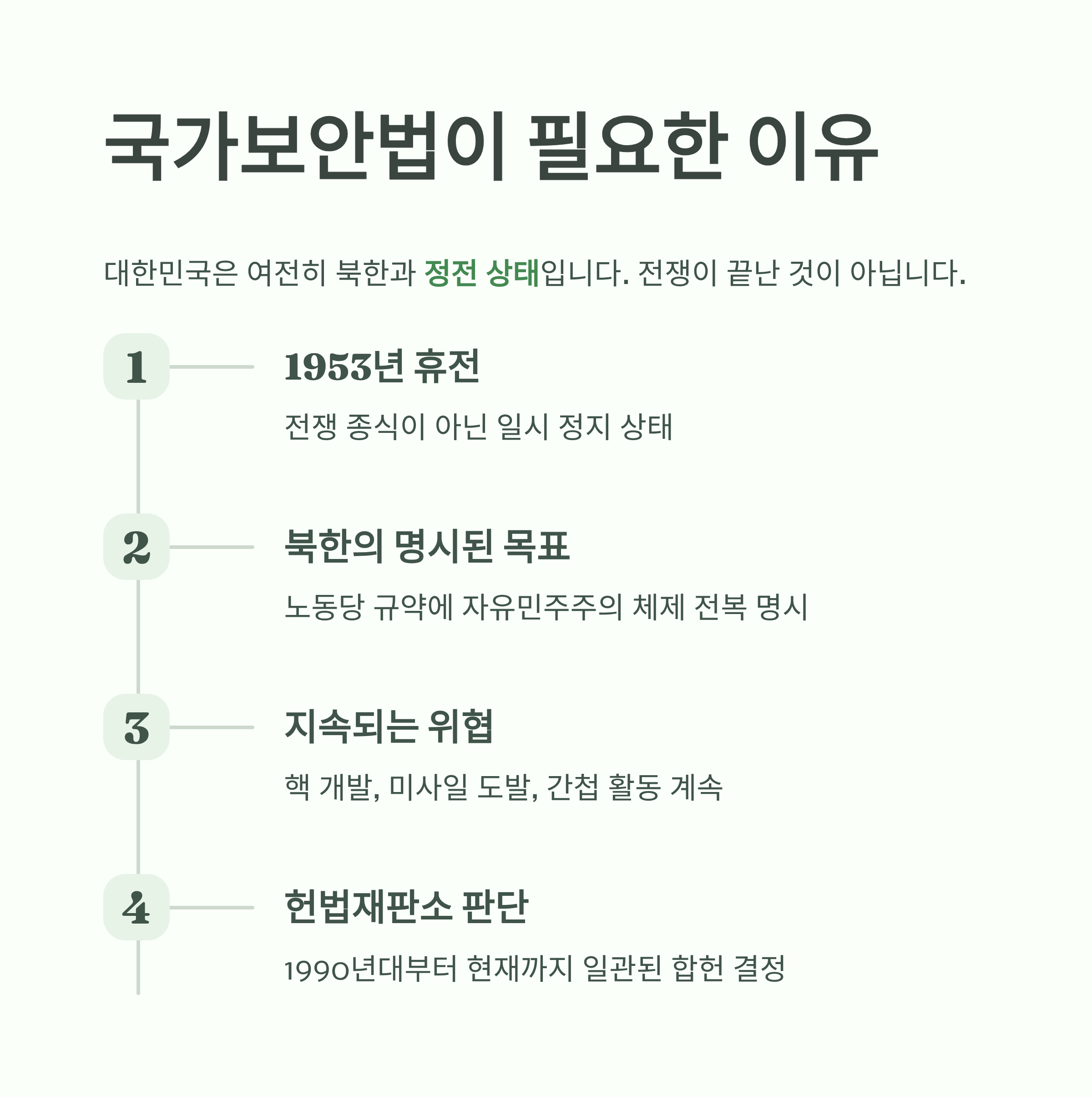 국가보안법의 필요성: 대한민국은 여전히 북한과 정전 상태에 있으며, 북한은 자유민주주의 체제 전복 목표를 포기하지 않았습니다. 국가보안법은 이러한 실질적 위협으로부터 국가를 보호하는 필수적인 법적 장치이며, 단순한 '표현의 자유 억압' 도구가 아닙니다.