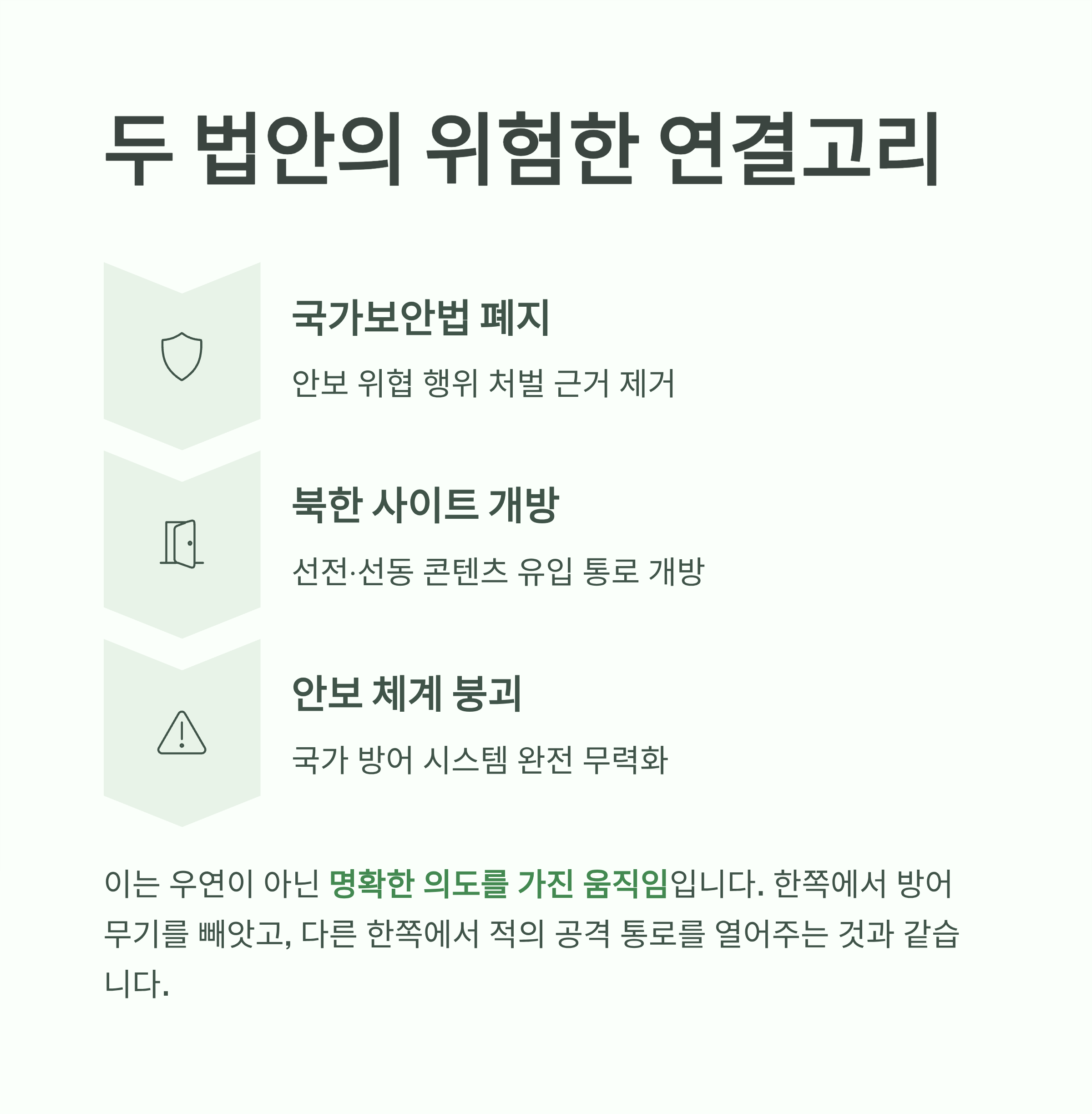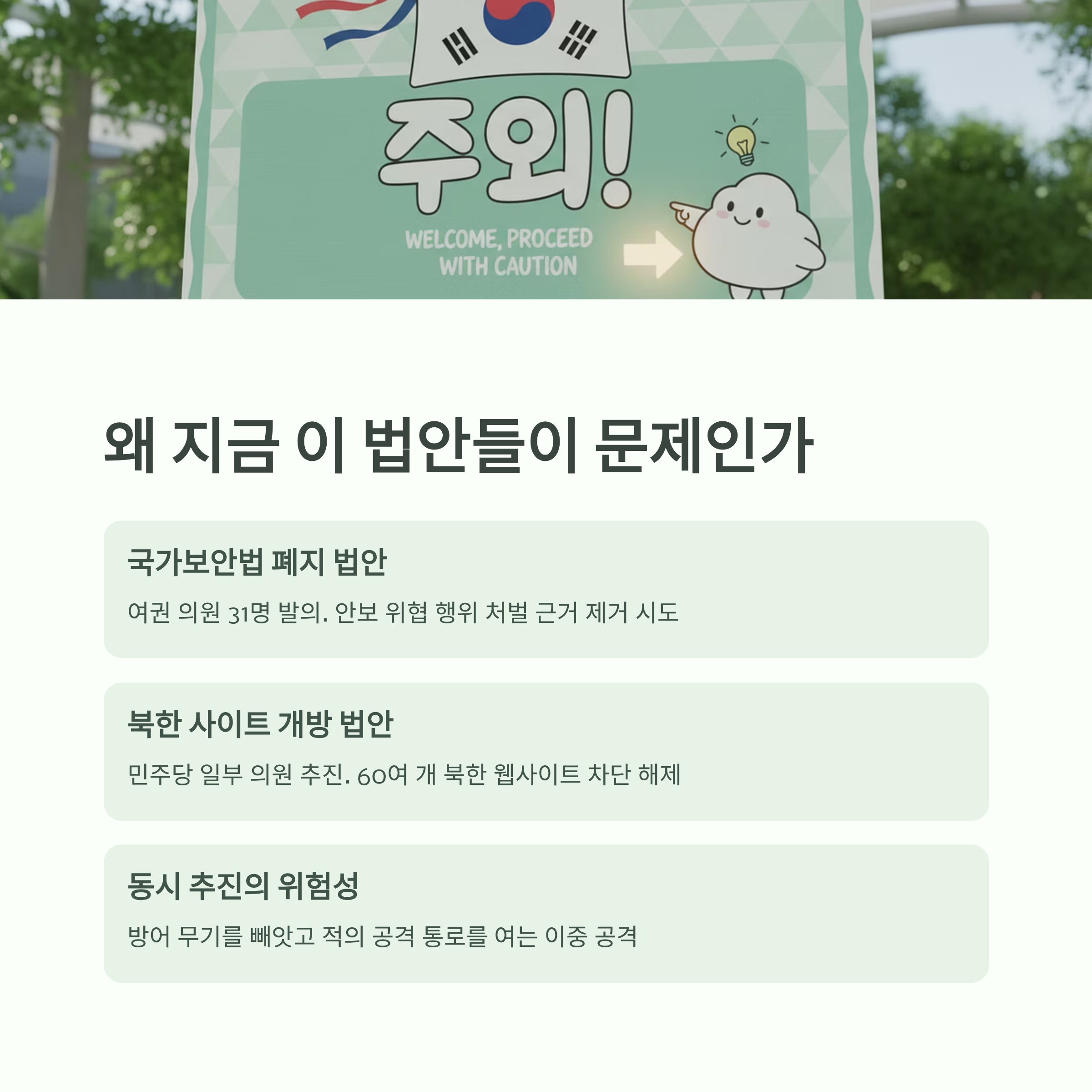 두 법안의 연관성: 국가보안법 폐지는 안보 위협 행위를 처벌할 법적 근거를 없애고, 북한 사이트 개방은 그 위협의 수단과 통로를 열어주는 역할을 합니다. 두 법안은 결국 대한민국의 안보 체계를 무력화하려는 의도된 흐름으로 해석해야 합니다.