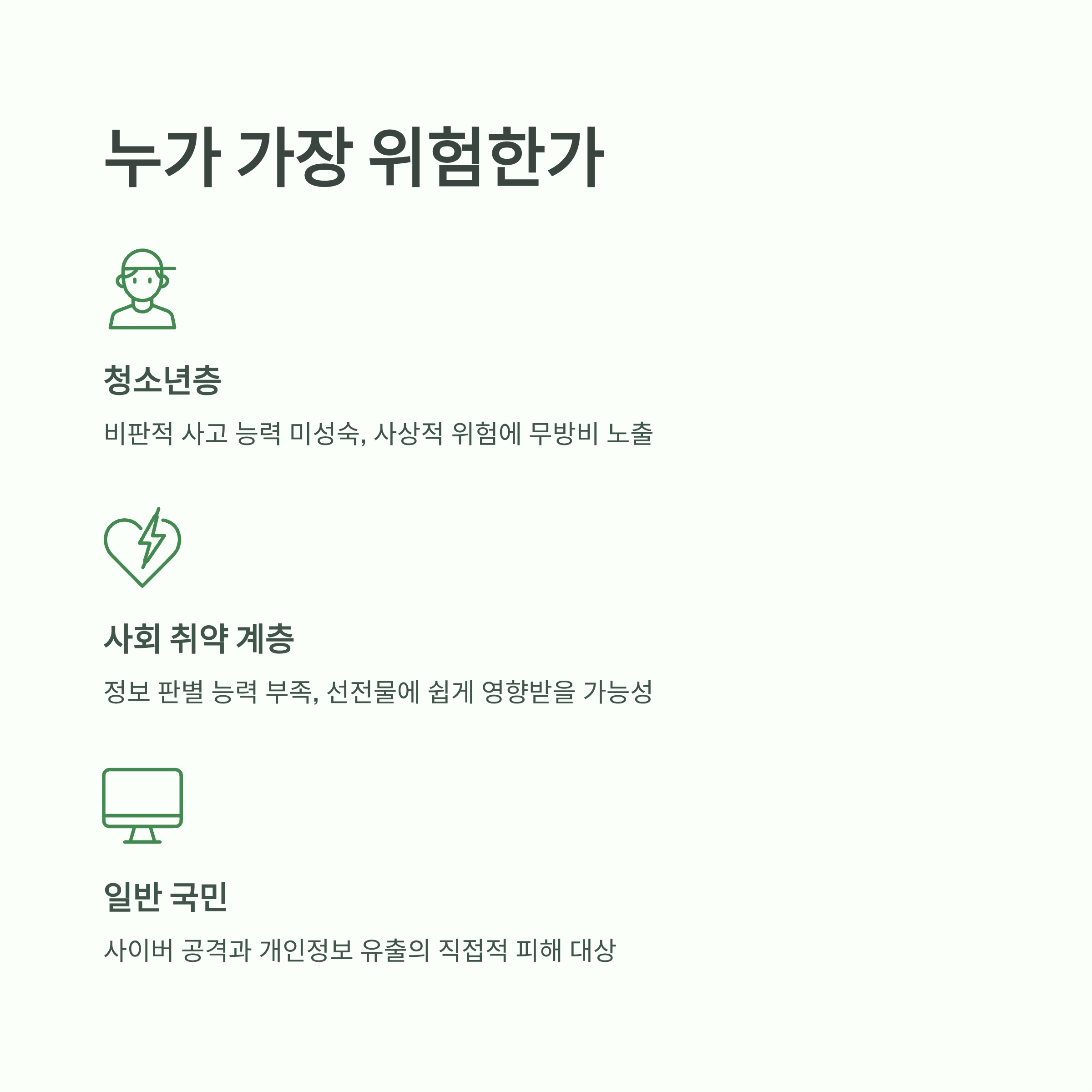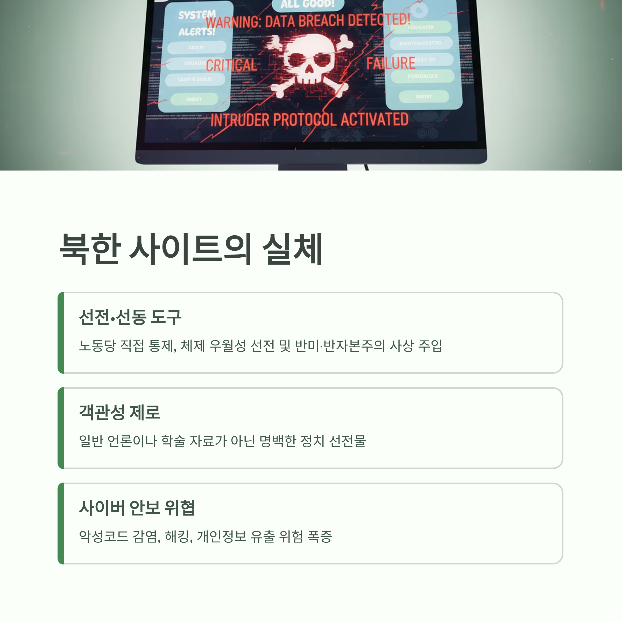 북한 사이트의 실체: 북한 웹사이트는 객관적 정보 제공 매체가 아닌, 체제 선전과 사상 주입을 목적으로 하는 선전·선동 도구입니다. 이에 대한 무분별한 접근 허용은 국민, 특히 청소년층의 사상적 혼란을 야기하고 해킹 및 악성코드 유포 등 심각한 사이버 안보 위협을 초래합니다.