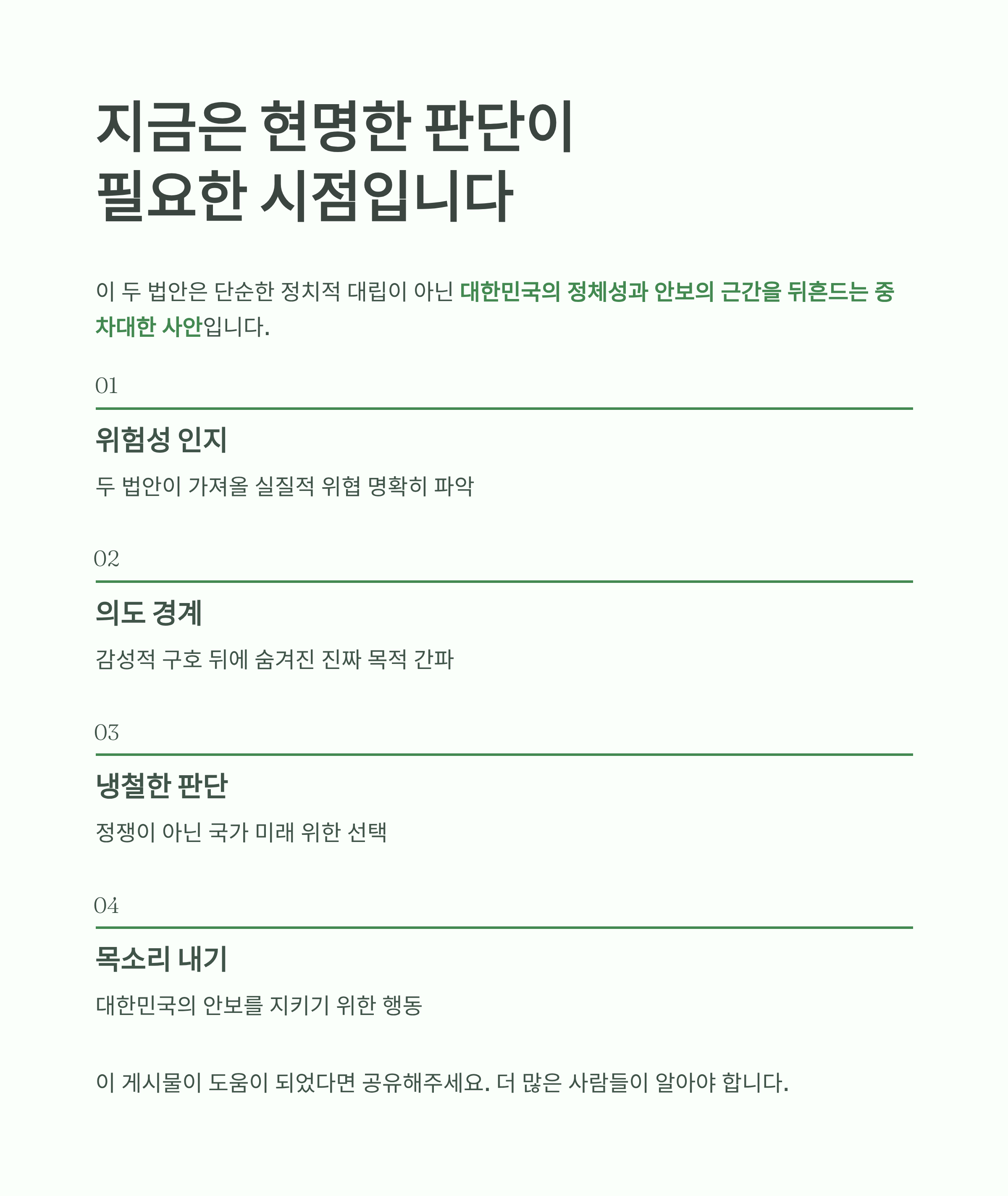 따라서, 이 두 법안의 추진은 대한민국의 안보 체계를 근본적으로 흔드는 위험한 시도이며, 국가의 존립을 위협할 수 있는 중대한 사안으로 인식해야 합니다.