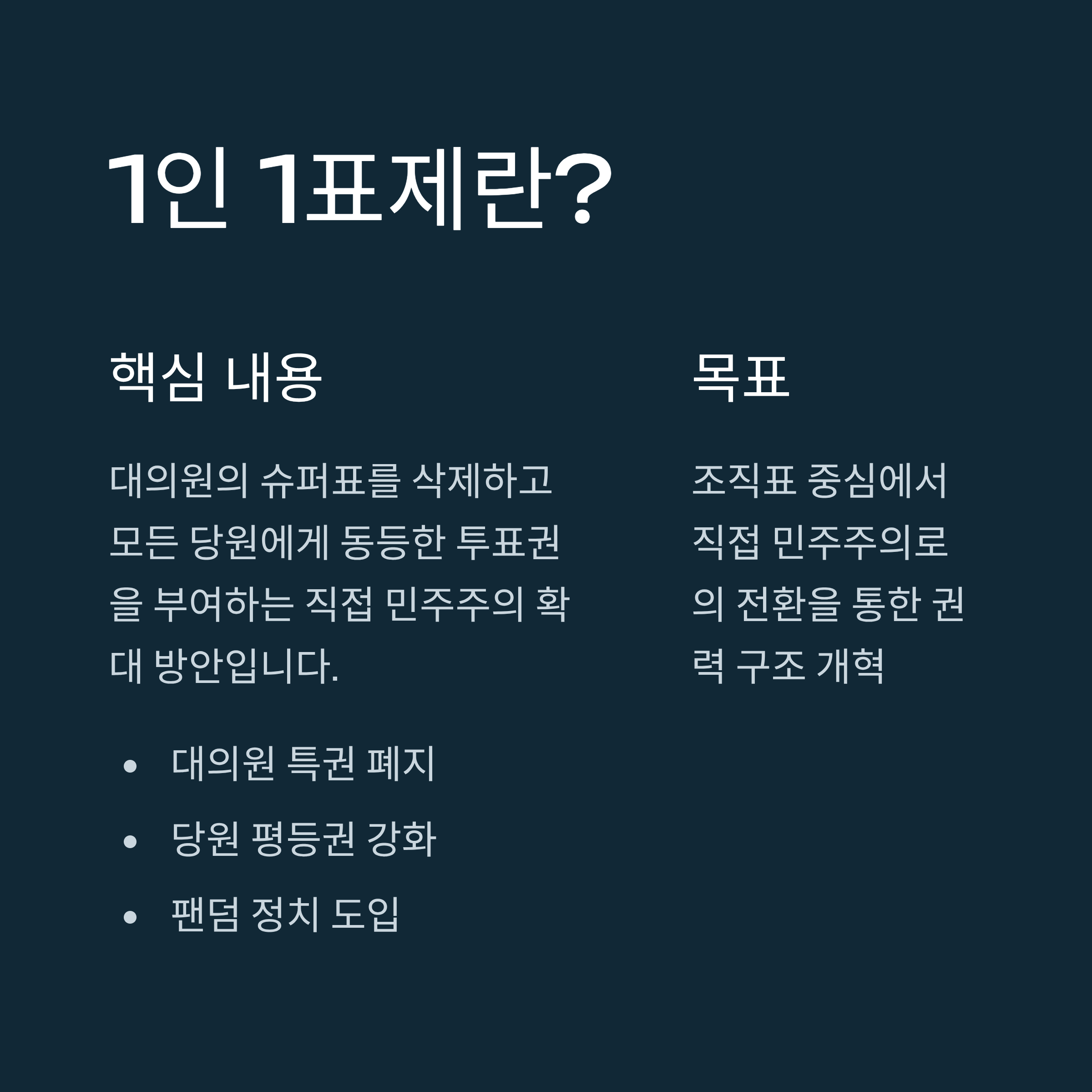 | A. 1인 1표제는 대의원의 '슈퍼표'를 제거하고 모든 당원이 동일하게 한 표를 행사할 수 있도록 한 제도로, 직접 민주주의의 확대를 목표로 합니다. |