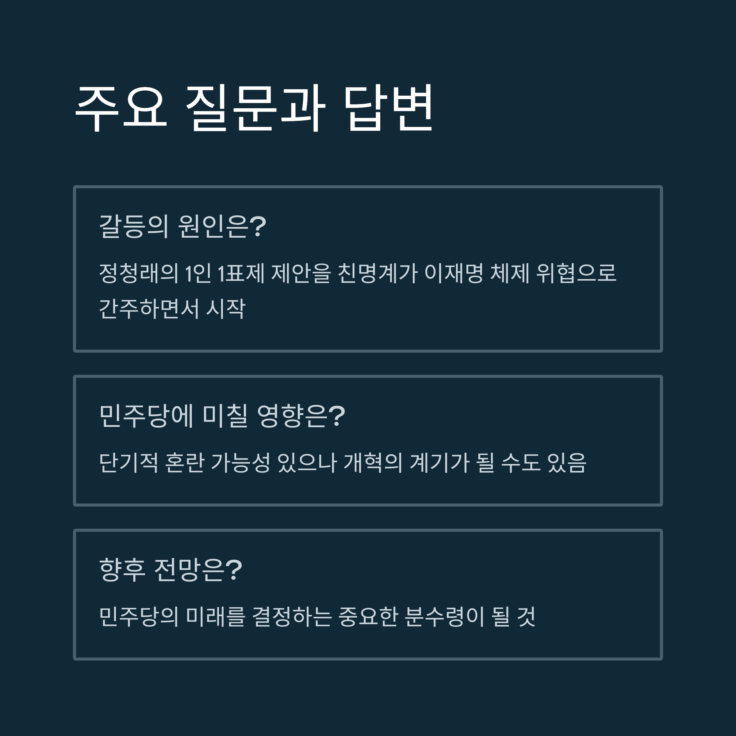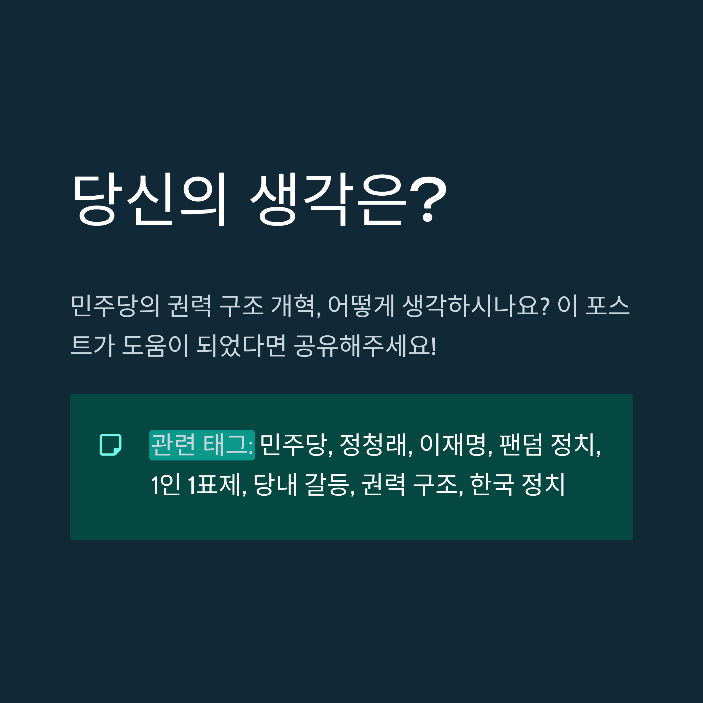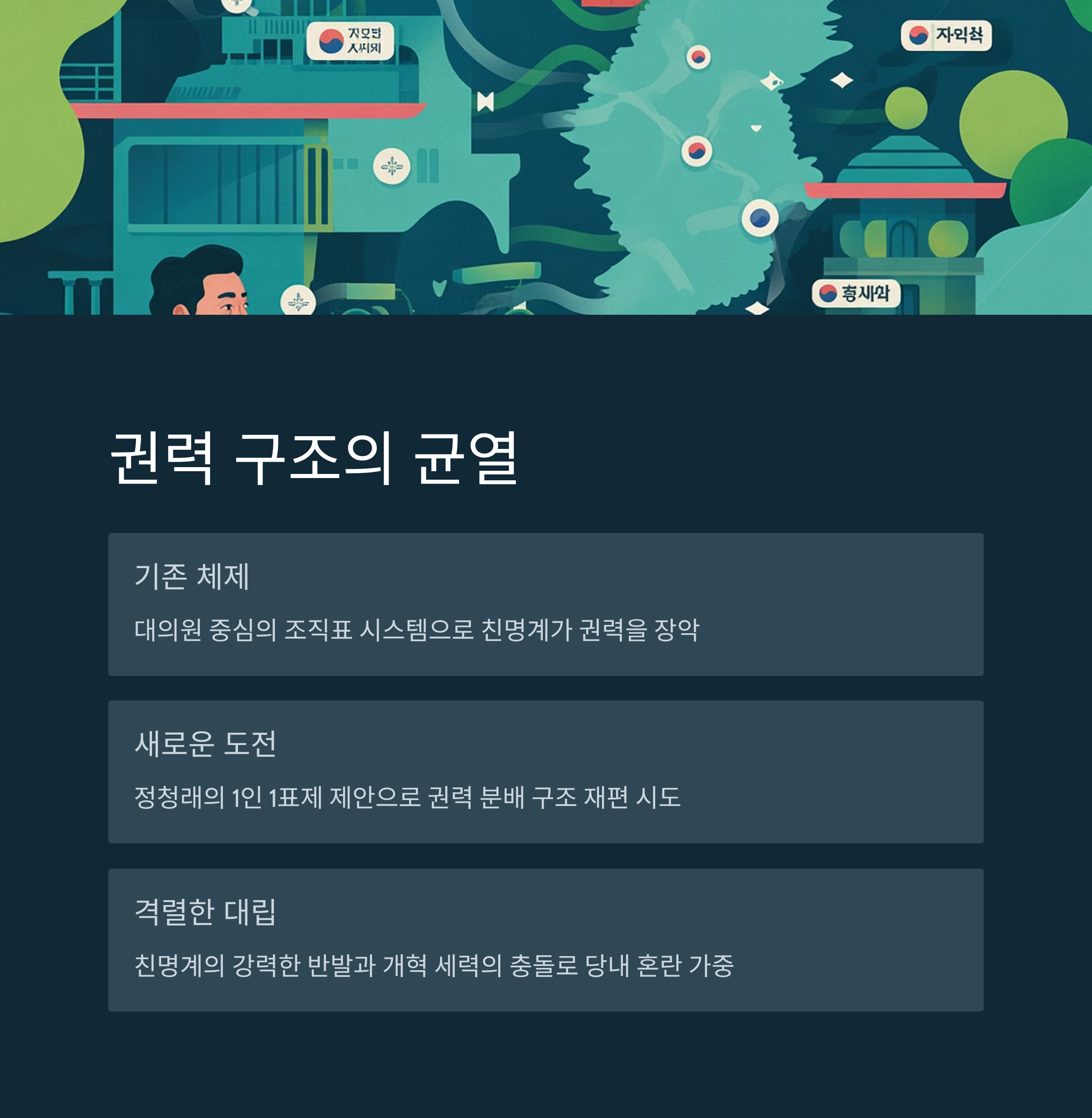관련 태그: 민주당, 정청래, 이재명, 팬덤 정치, 1인 1표제, 당내 갈등, 권력 구조, 한국 정치, 대의제