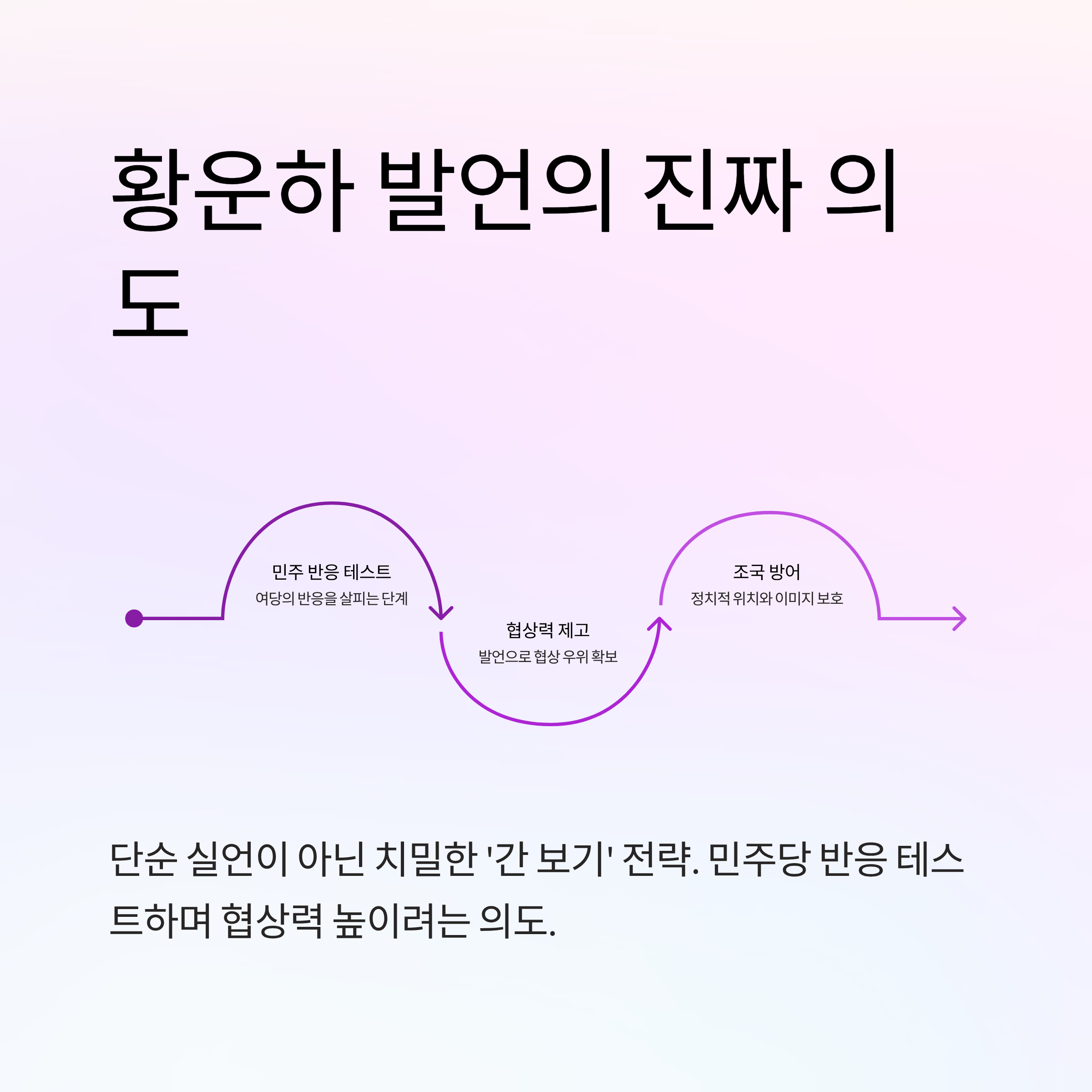 | A1. 조국혁신당이 민주당에 흡수될 경우 존재감이 사라질 것을 우려해, 협상력을 높이고자 선제적으로 '몸값'을 올리려는 의도로 보입니다. 또한, 조국 대표의 의중을 대신해 민주당의 반응을 떠보기 위한 '간 보기' 성격도 짙습니다. |