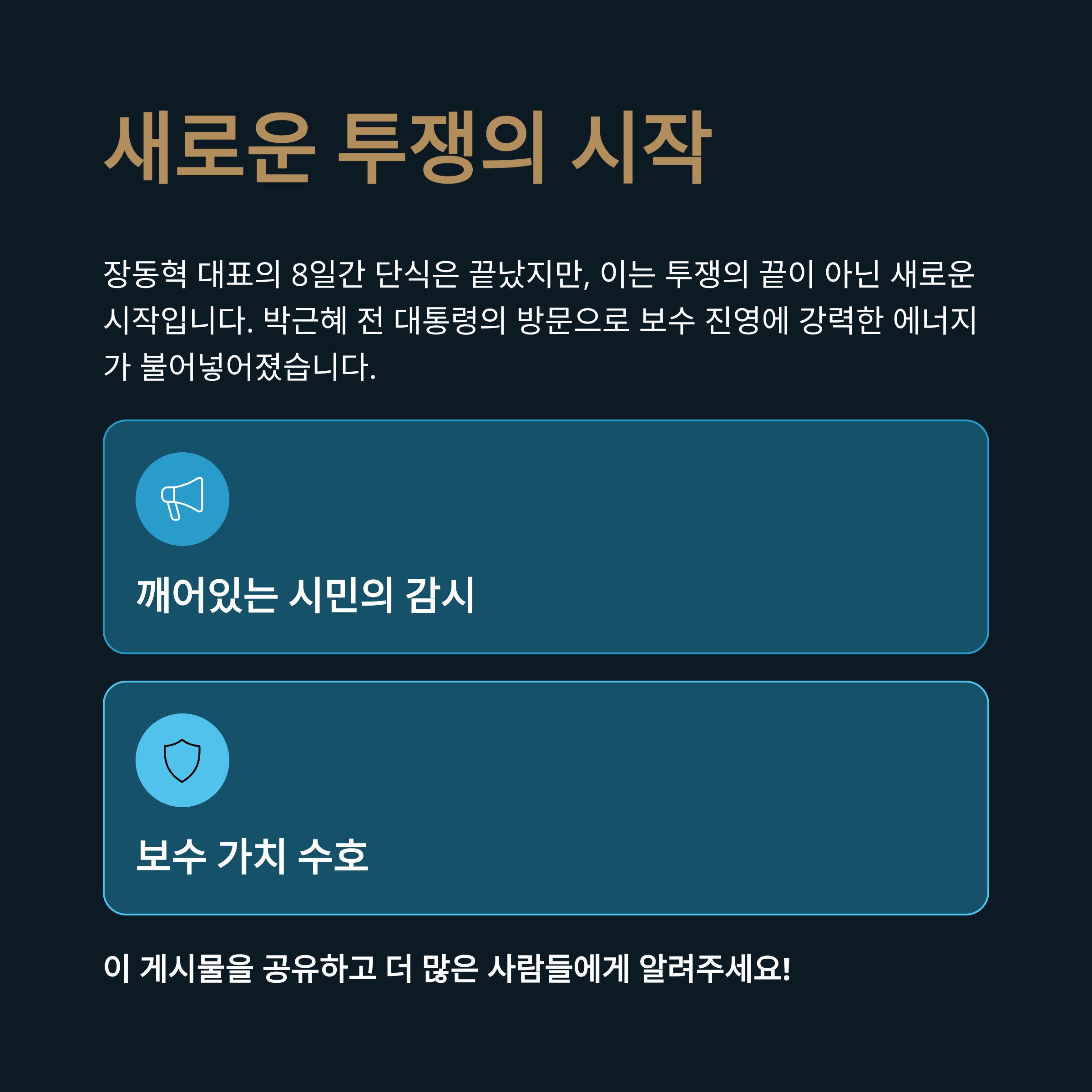 박근혜 전 대통령의 호소로 장동혁 대표는 8일간의 목숨을 건 단식을 멈추고 병원으로 이송되었습니다. 이는 투쟁의 끝이 아니라 새로운 시작을 알리는 신호탄입니다. 박 전 대통령의 방문은 패배주의에 젖을 수 있었던 보수 진영에 강력한 에너지를 불어넣었습니다. 국민의힘은 이제 장 대표의 희생을 헛되이 하지 않기 위해 쌍특검법 통과와 윤석열 전 대통령의 명예 회복을 위해 총력전을 펼칠 것입니다.