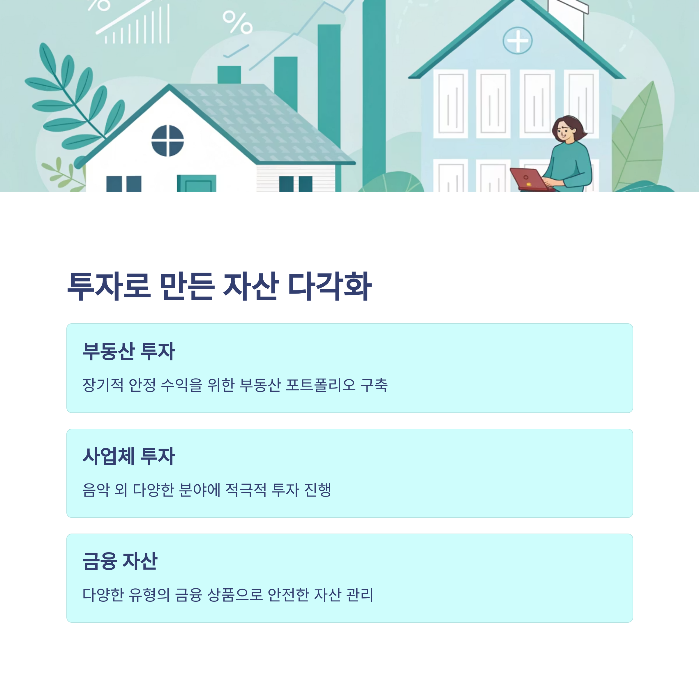 | A. 박재범은 음원 저작권료, 공연 수익, 부동산 투자 등 다양한 수입원을 통해 안정적인 자산을 형성했습니다. 또한 아버지로부터 전문적인 자산 관리를 받으며 체계적인 재산 증식을 이어가고 있습니다. |
