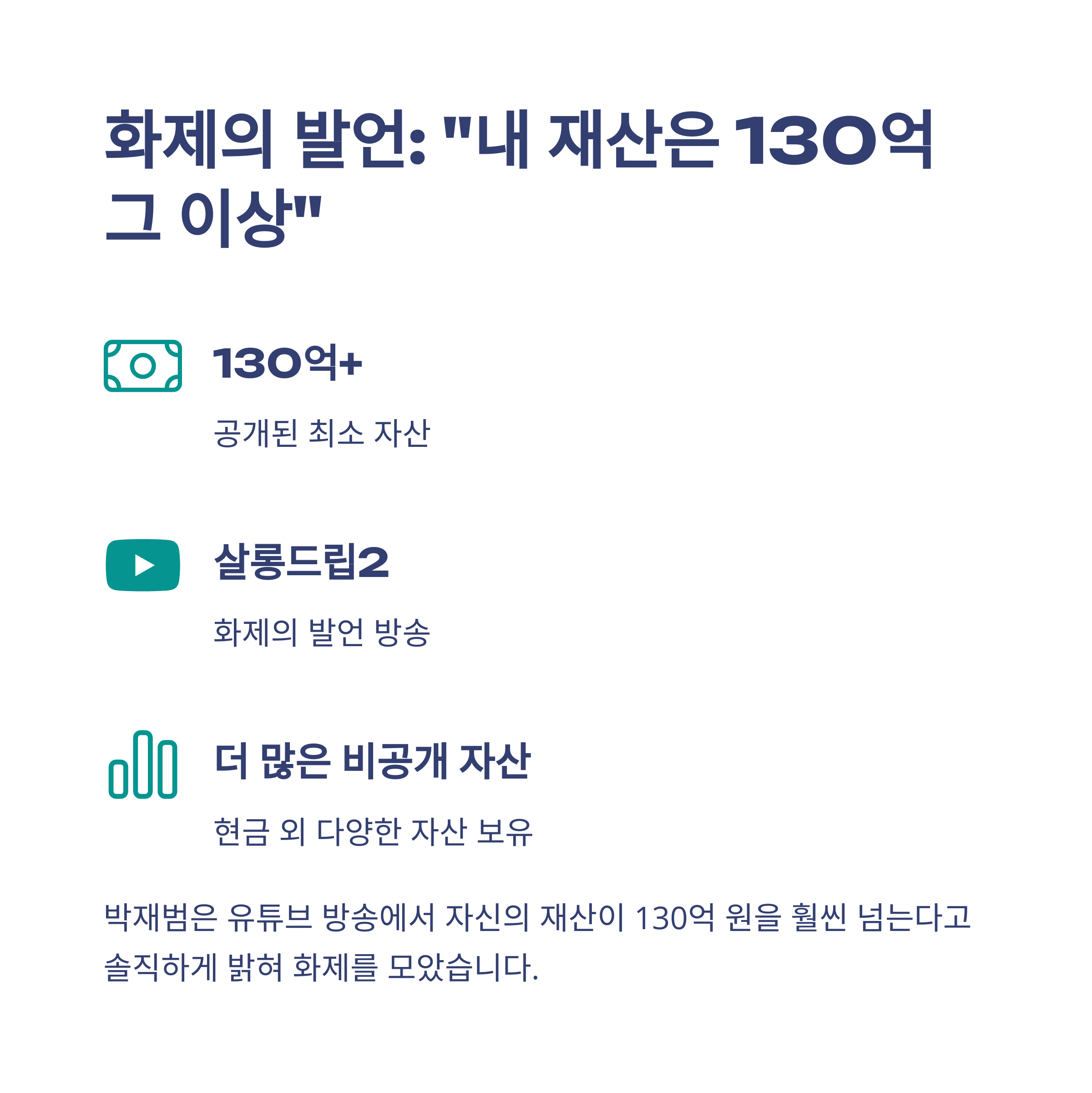 • 박재범은 방송에서 130억 원 이상의 재산을 보유했음을 확인시켰습니다.