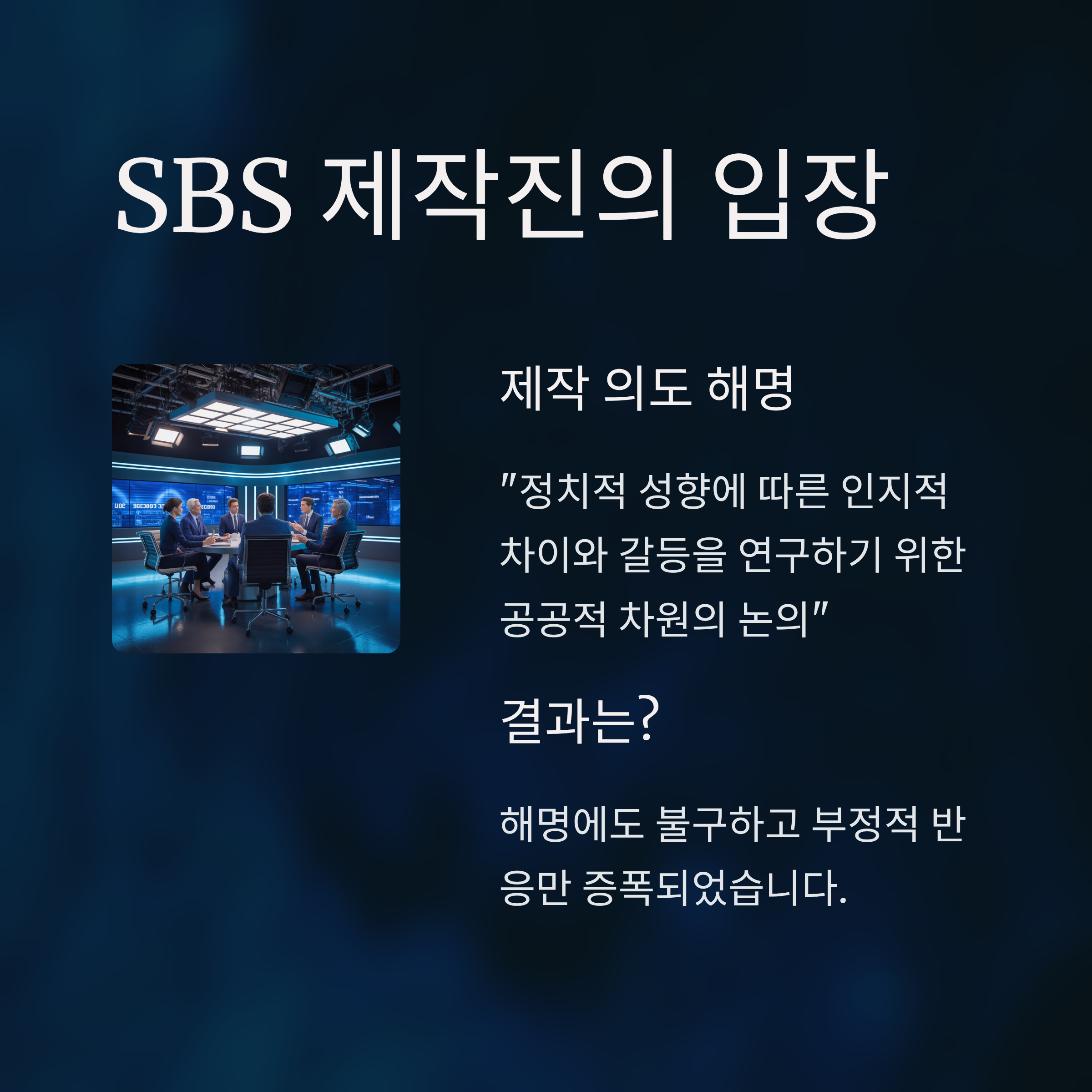 3. SBS는 공공적 차원의 논의 및 연구 의도라고 해명했으나, 반응은 오히려 부정적으로 돌아섰습니다.