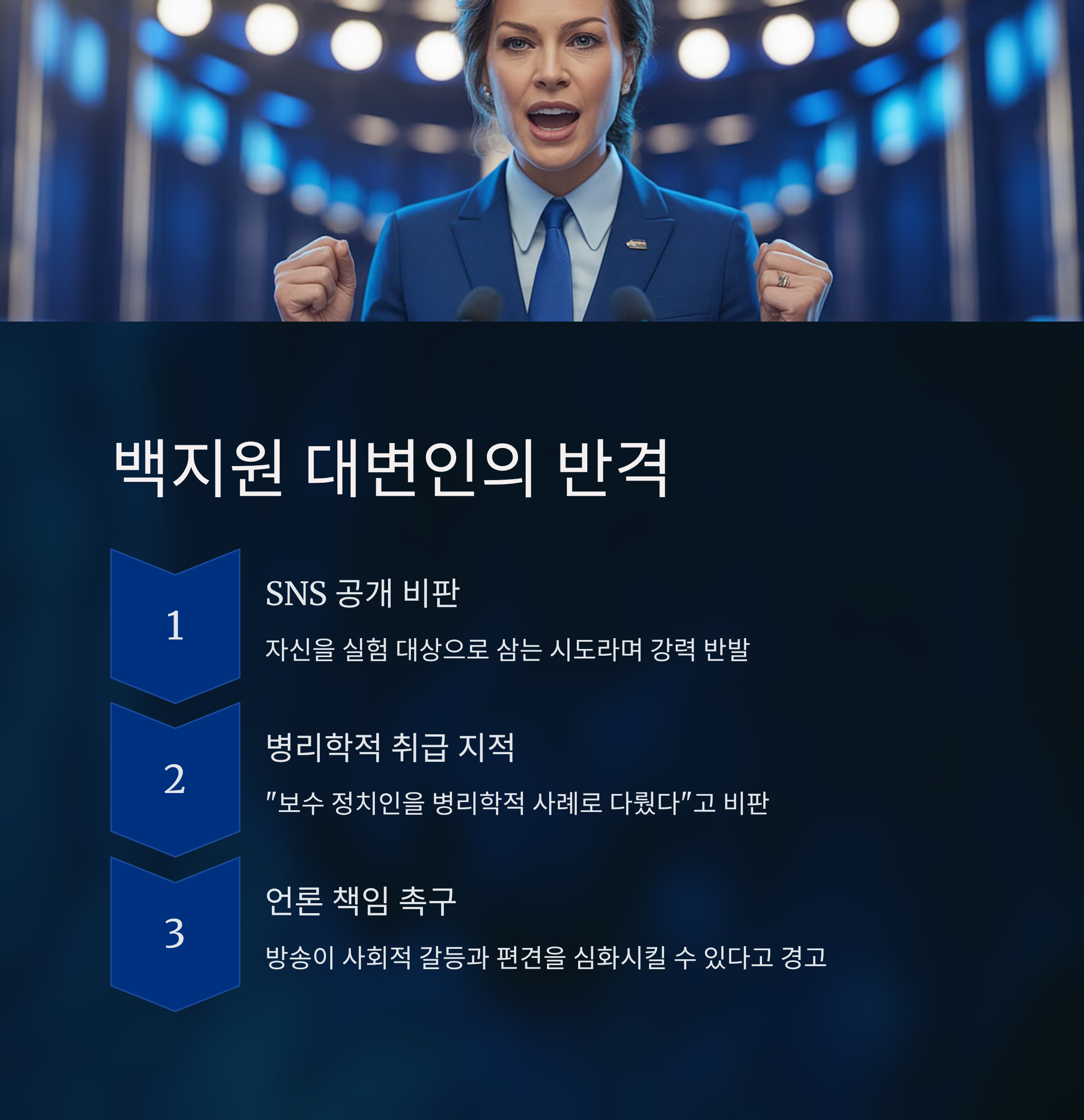 백지원 대변인은 자신이 특정 정치 성향을 대표하는 사례로 조명된 것에 대해 강하게 반발하며, "보수 정치인을 병리학적 사례로 취급했다"는 점을 강조했습니다. 이는 곧 정치적 대립의 구도가 이성적인 논의 대신 감정적 반작용을 강조하는 현실을 반영합니다. 나아가 대변인은 방송 콘텐츠가 사회적 갈등과 편견을 심화시킬 가능성을 언급하며, 언론의 공정성과 사회적 책임을 묻고 있습니다.