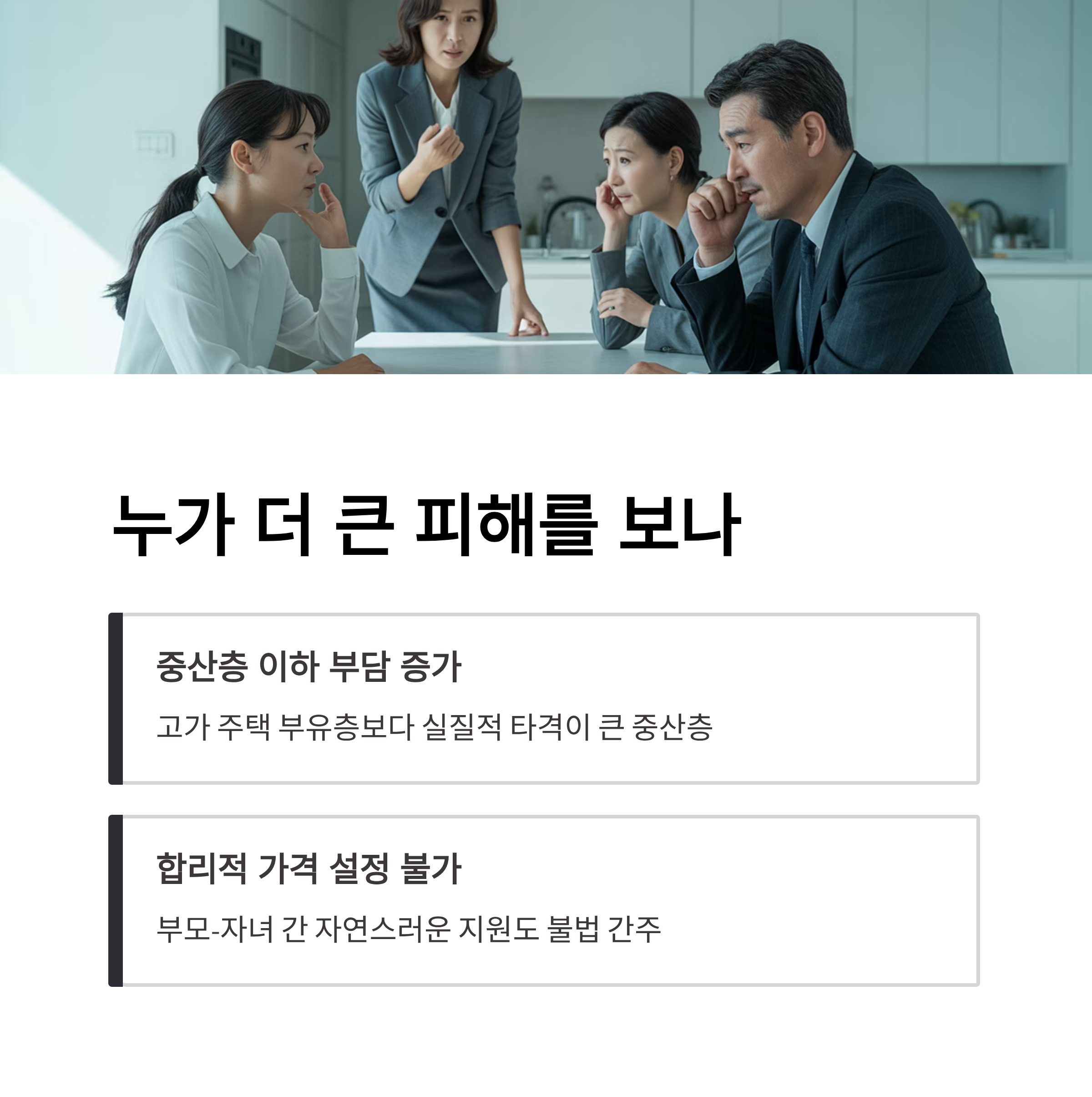 더불어, 이 정책은 고가 주택 또는 특정 지역에 거주하는 부유층보다는 중산층 이하의 국민들에게 실질적인 부담을 안기고 있습니다. 부모가 단순히 자녀와의 자연스러운 지원 관계를 통해 합리적으로 가격을 설정하는 것도 정부가 설정한 기준 하에 불법으로 간주될 수 있는 현실은 납득하기 어렵습니다.