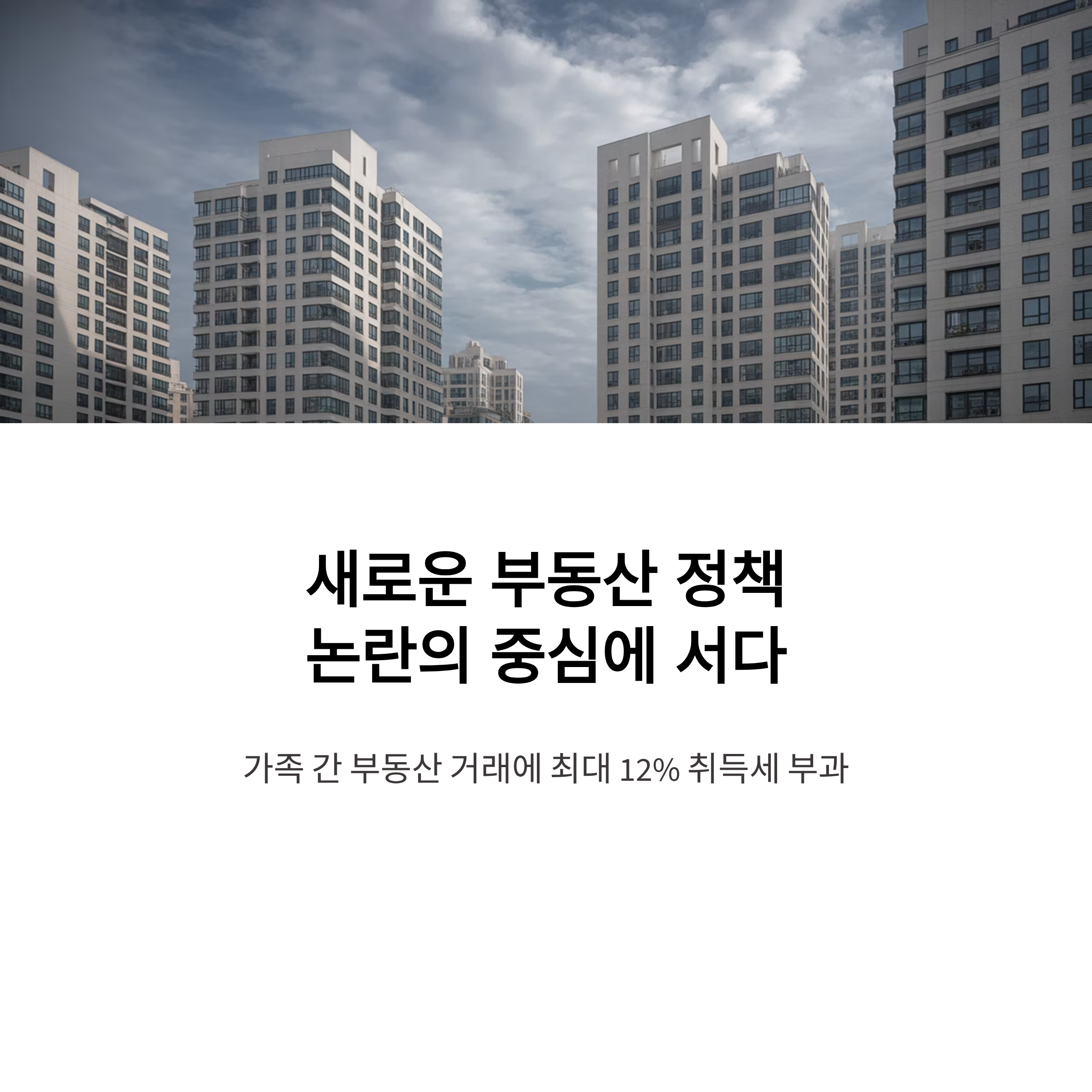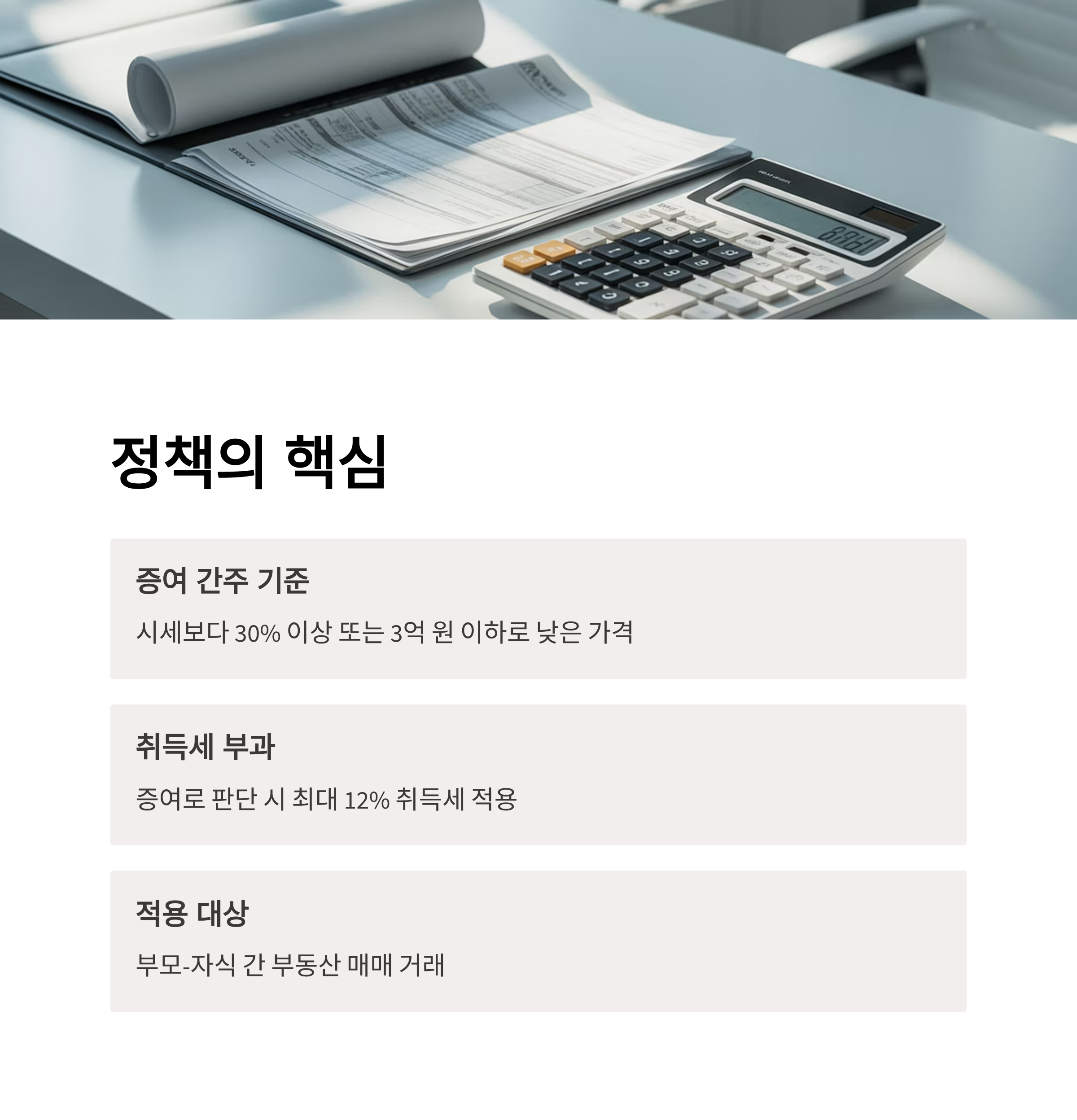 1. 정책 핵심: 가족 간 부동산 매매 시 시세보다 30% 이상 혹은 3억 원 이하로 가격이 낮을 경우 증여로 간주, 최대 12% 취득세 부과.