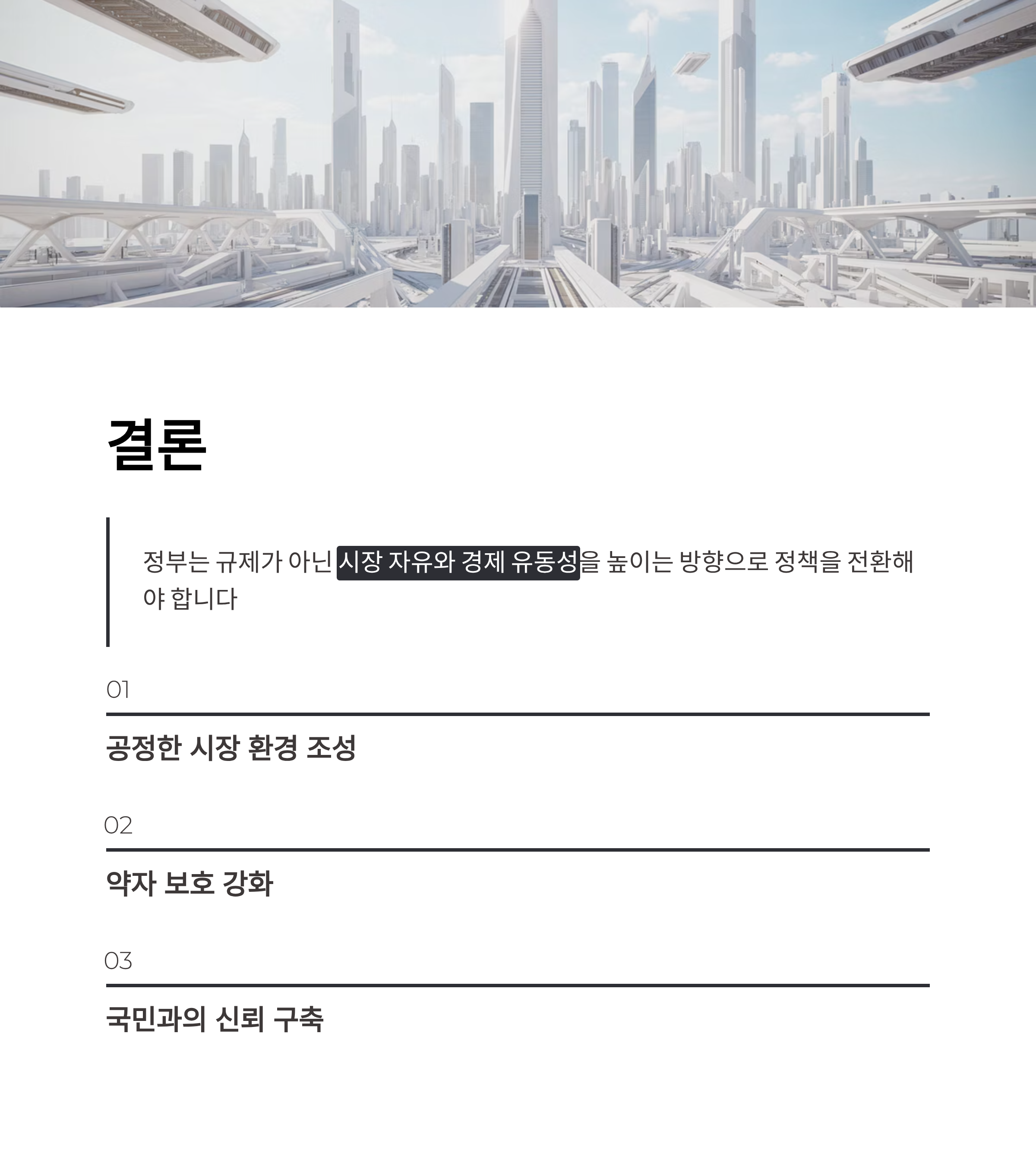 정부는 정책의 목표를 재정 수입 확대에서 벗어나 공정한 시장 환경 조성과 약자에 대한 보호로 전환해야 합니다. 이는 규제가 아닌 시장 자유와 경제 유동성을 높이는 방향으로 진행되어야 합니다. 또한 감시와 통제보다는 국민과의 신뢰 구축을 통해 경제 정책이 국민 삶에 실질적인 긍정적 영향을 미칠 수 있도록 노력이 필요합니다.