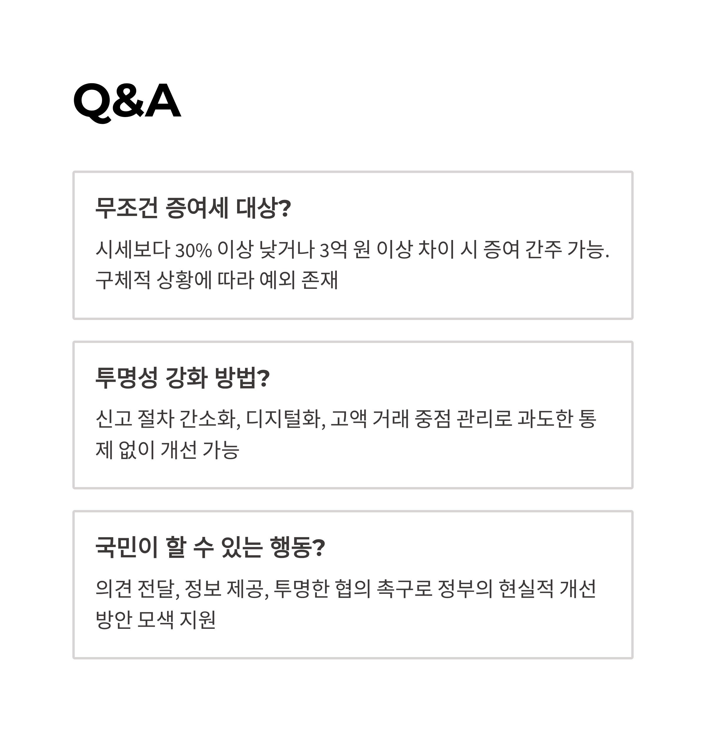 | A. 투명성을 강화하기 위해선 신고 절차 간소화, 디지털화, 중점 관리 대상으로 고액 거래를 선정하는 방식을 활용할 수 있습니다. 과도한 모든 거래 통제는 오히려 역효과를 불러올 수 있습니다. |
