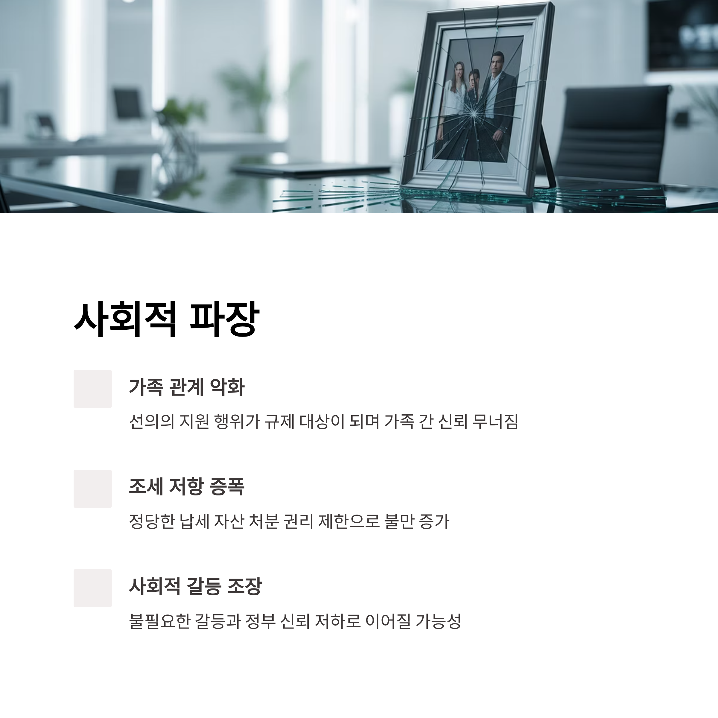 정책이 시행되면서 국민들 사이에서는 조세 저항과 불신이 증폭되고 있습니다. 정당하게 납세한 자산으로 가족을 돕는 선의의 행위마저 규제 대상이 되는 상황은 정부에 대한 신뢰를 무너뜨릴 수 있습니다. 국민 입장에서는 스스로의 자산을 처분하거나 자녀에게 물려주는 기본적인 권리조차 심하게 제한받고 있다는 불만이 증가하고 있습니다.