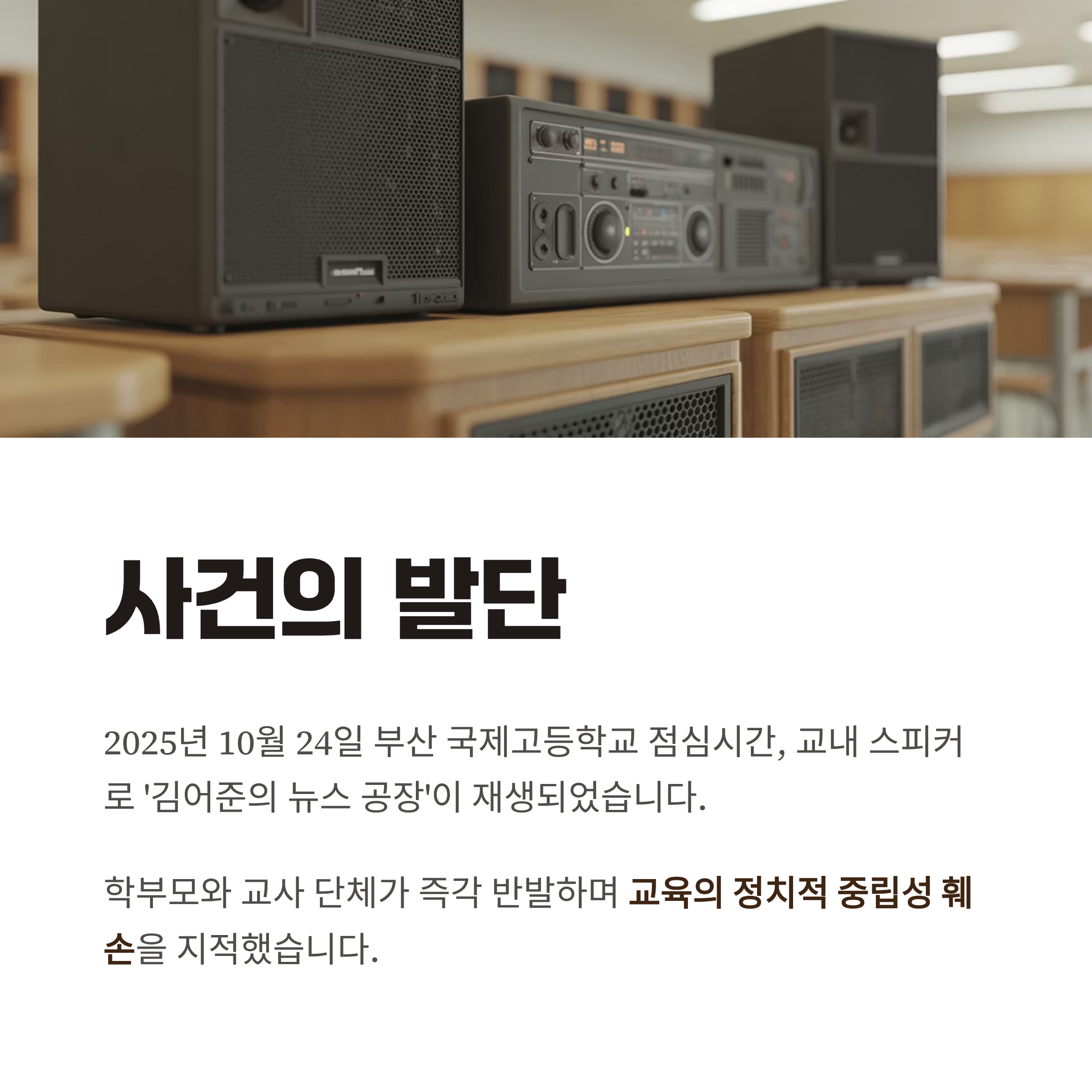 1. 부산 국제고등학교에서 점심시간 중 진보 성향의 '김어준의 뉴스 공장'이 재생되어 교육의 정치적 중립성과 관련된 비판이 이어졌습니다.