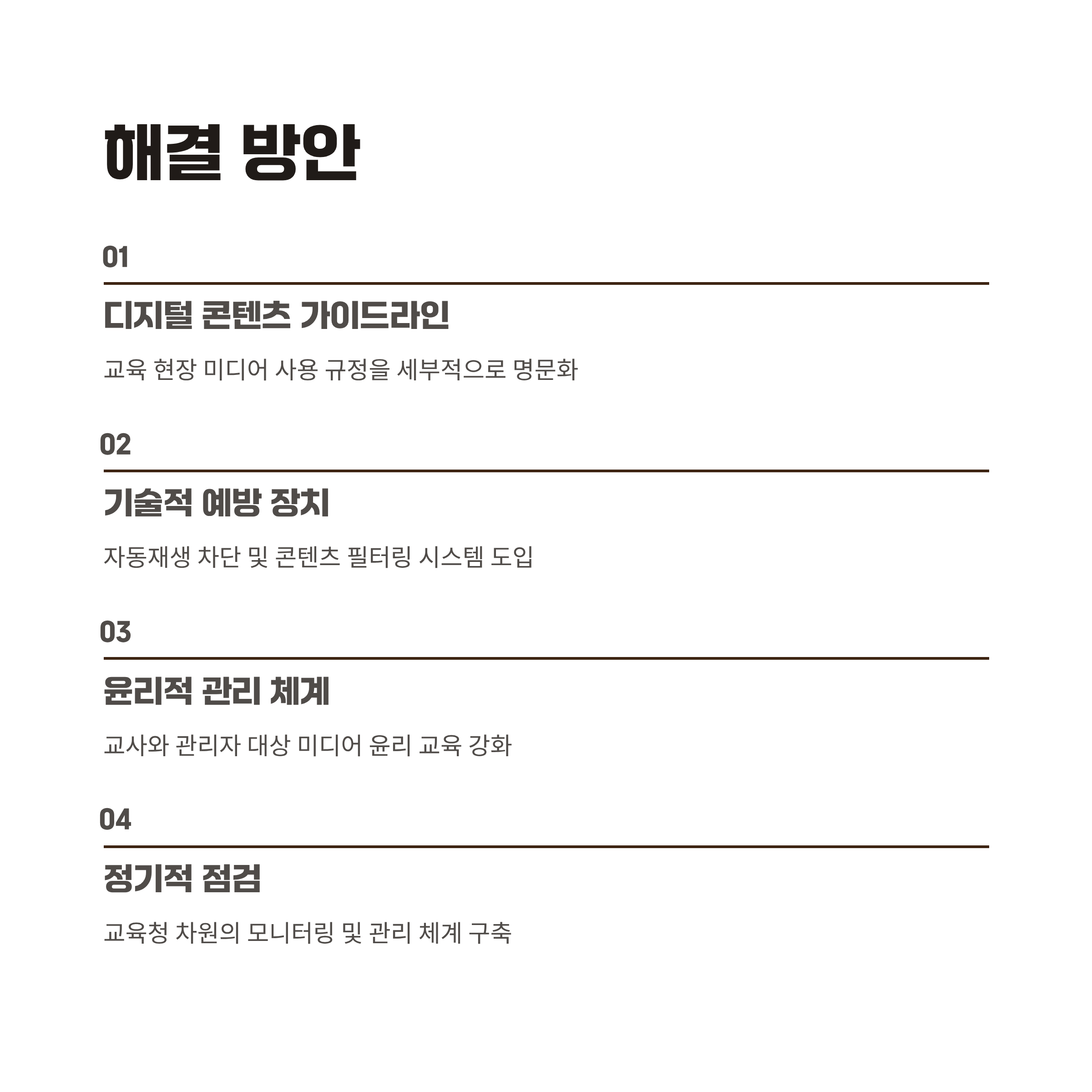 | A. 교육 현장의 디지털 콘텐츠 사용 가이드를 세부적으로 설정하고, 책임 있는 미디어 관리 체계를 강화해야 합니다. 기술적 예방책 마련도 필요합니다. |