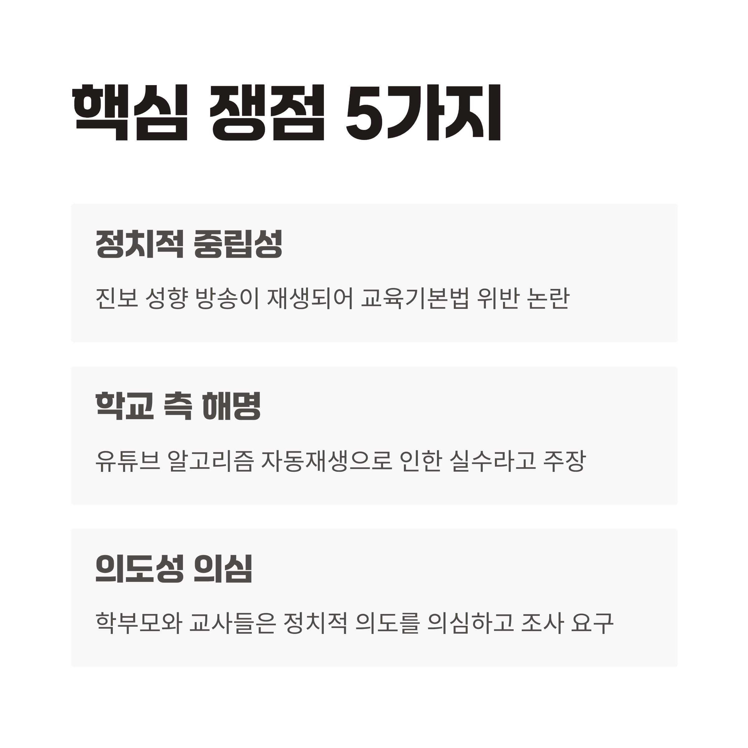 2. 학교는 유튜브 알고리즘으로 발생한 오해라고 해명했지만, 학부모와 교사 단체는 정치적 의도를 의심하고 있습니다.