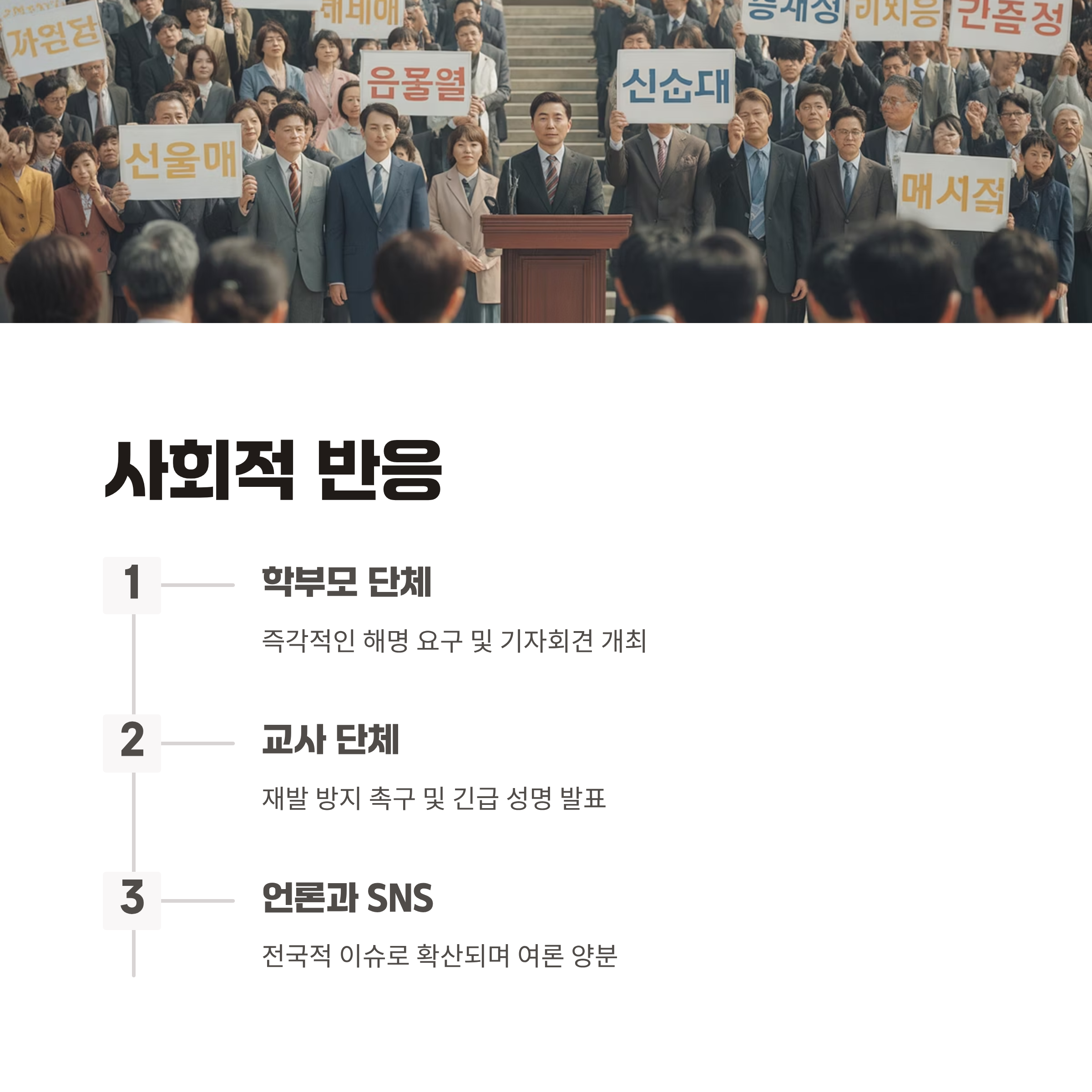 이번 사건이 언론과 SNS를 통해 확산되면서 학부모 단체와 교사 단체가 즉각적인 해명을 요구하고, 재발 방지를 촉구하는 기자회견을 열었습니다. 일부에서는 정치적 의도를 의심하며 구체적인 조사와 책임자 문책을 요구하고 있습니다. 반대로, 단순한 실수로 간주하자는 주장도 제기되어 여론은 양분된 상태입니다.