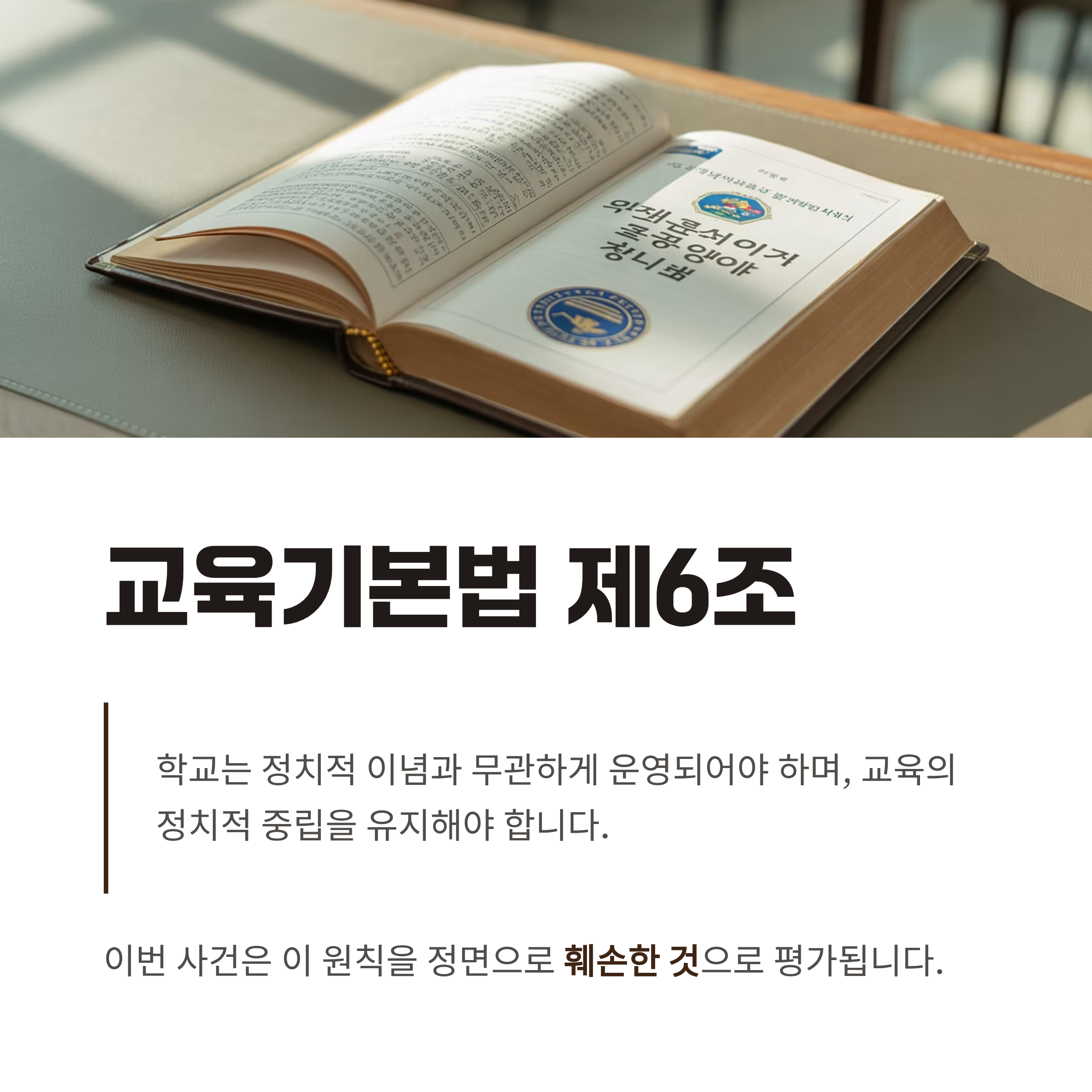 3. 교육기본법 제6조에 따라 학교는 정치적 이념과 무관하게 운영되어야 하며 이번 사건이 그 원칙을 훼손한 것으로 평가됩니다.