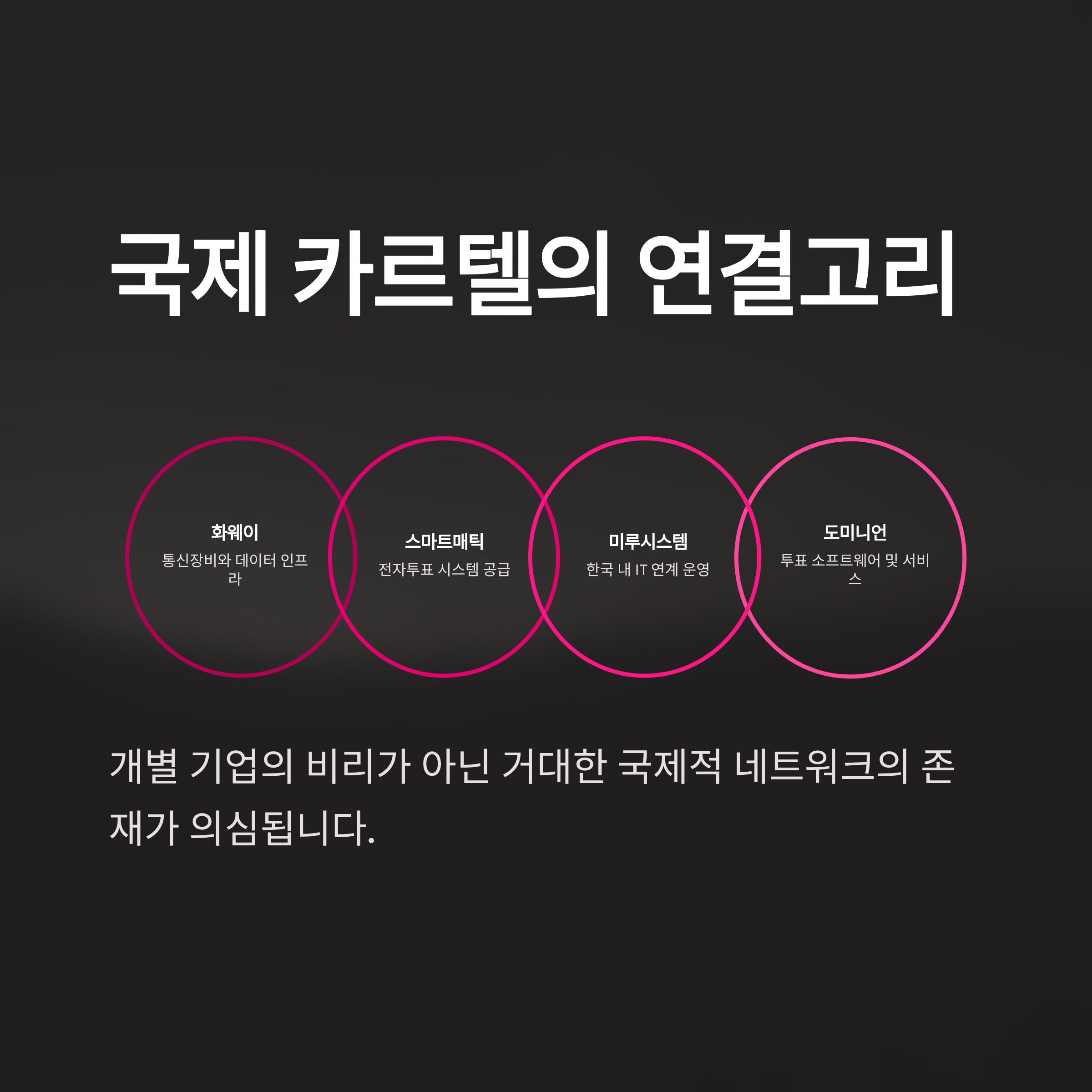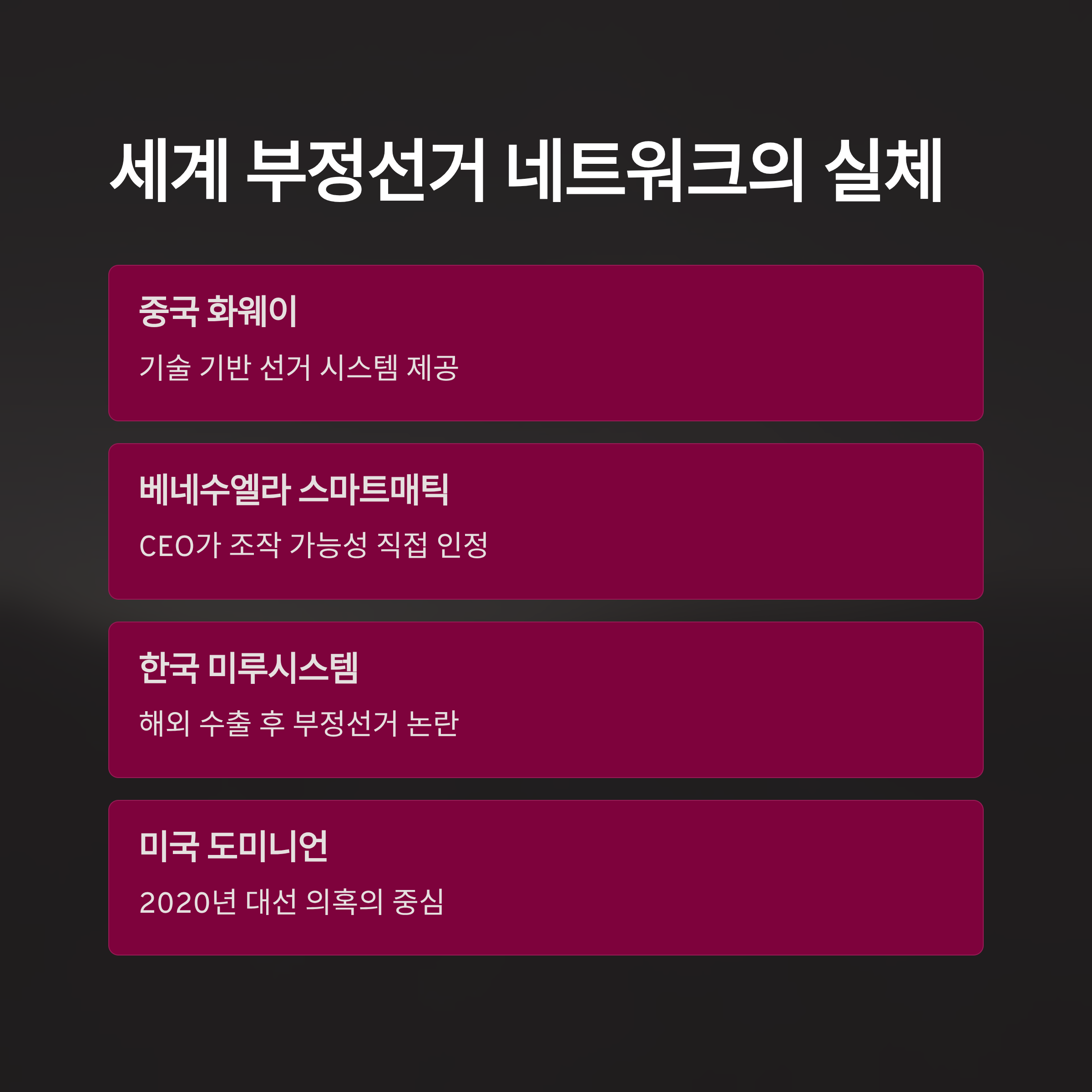 스마트매틱과 미루 시스템, 그리고 중국의 화웨이와 미국의 도미니언으로 이어지는 이 연결고리는 단순히 개별 기업의 비리가 아닌, 거대한 국제적 카르텔의 존재를 의심케 합니다. 베네수엘라의 마두로 정권이 스마트매틱을 통해 장기 집권의 기반을 마련했던 것처럼, 한국의 선거 시스템 또한 외부의 개입이나 내부의 조작으로 인해 오염되었을 가능성을 배제할 수 없습니다. CEO가 직접 조작 가능성을 실토한 스마트매틱의 사례는, 유사한 방식의 전자 개표 시스템을 운용 중인 한국 선거 환경에도 심각한 경종을 울리고 있습니다.