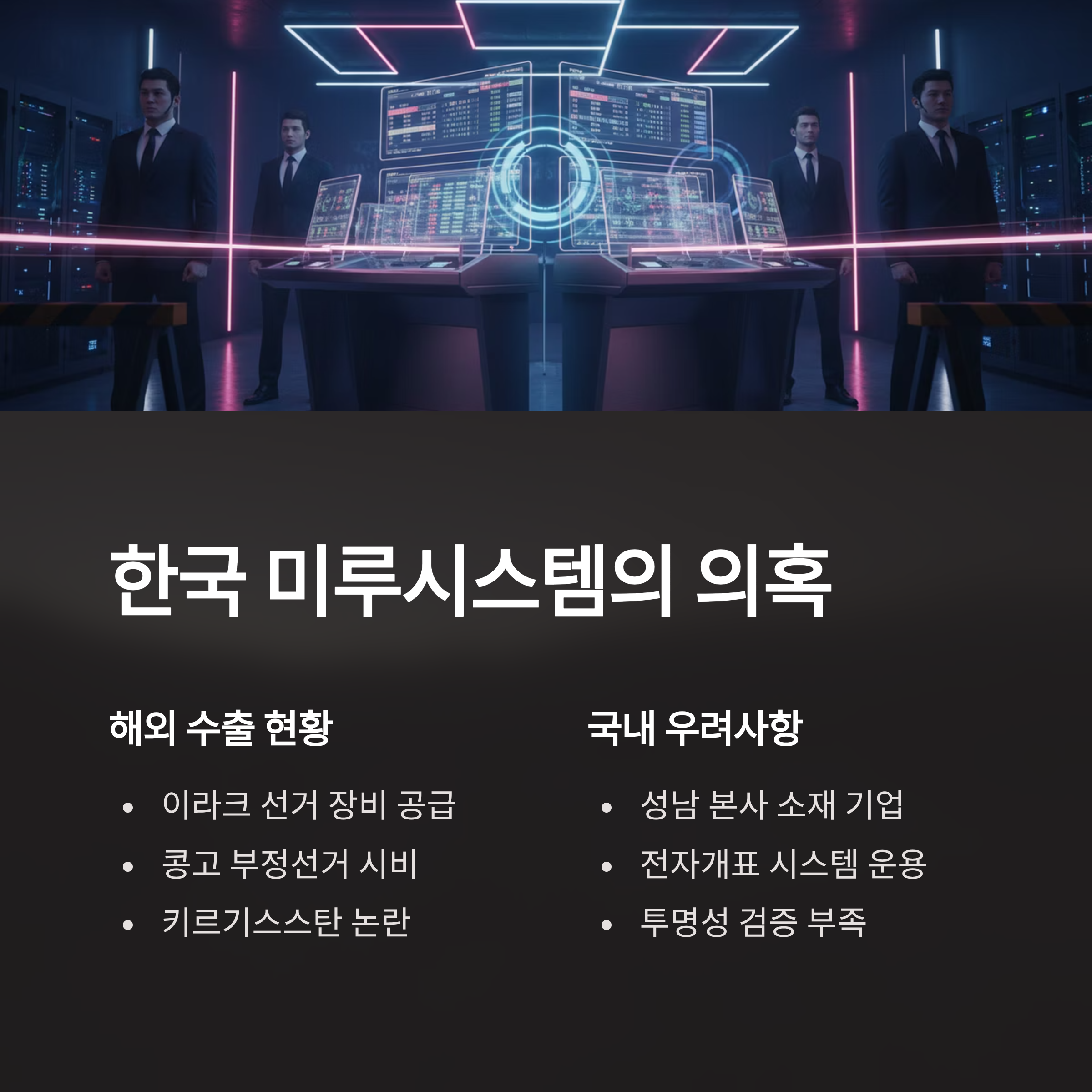 | 미루 시스템 | 한국 성남 소재 기업, 이라크/콩고 등 수출 후 부정 의혹 제기 | 한국 선거 운용 |