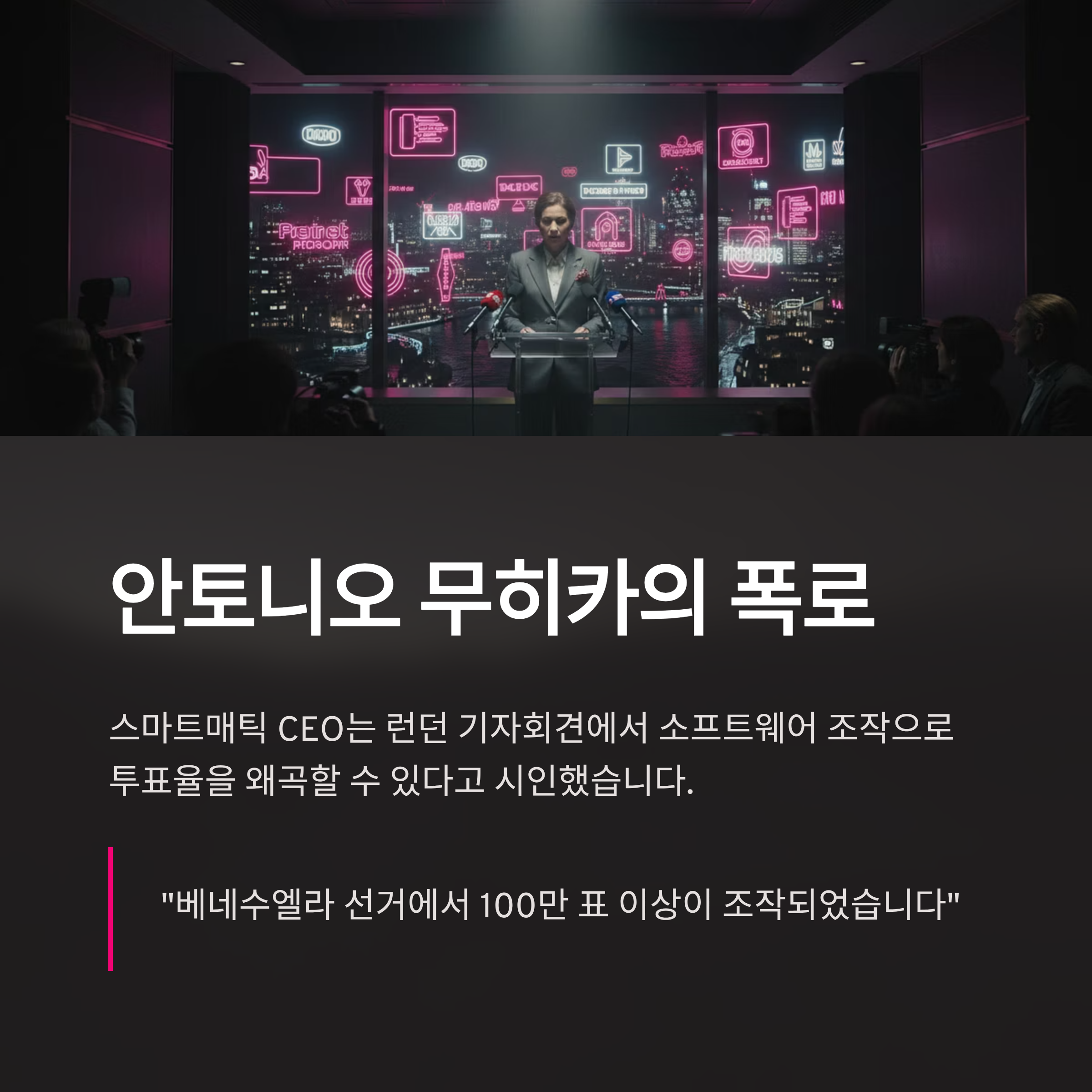 전 세계 자유 민주주의의 근간을 뒤흔드는 부정선거 의혹이 끊임없이 제기되는 가운데, 그 중심에 있는 선거 시스템 업체 CEO의 충격적인 발언이 공개되어 파문이 일고 있습니다. 현재 부정선거의 흐름은 중국의 화웨이 시스템, 베네수엘라의 스마트매틱(Smartmatic), 한국의 미루 시스템, 그리고 미국의 도미니언(Dominion)이라는 네 가지 거대한 축으로 연결되어 있다는 주장이 힘을 얻고 있습니다. 이러한 시스템들은 각국의 선거에 깊숙이 개입하여 민의를 왜곡하고 특정 세력의 집권을 돕는 도구로 악용되고 있다는 의혹을 받고 있습니다. 특히 이번에 공개된 영상은 스마트매틱의 CEO 안토니오 무히카가 런던 기자회견에서 직접 발언한 내용을 담고 있어 그 파급력이 상당합니다. 그는 선거 기계를 이용한 조작 가능성을 시인했을 뿐만 아니라, 실제로 베네수엘라 선거에서 100만 표 이상의 차이가 발생했음을 인정했습니다.